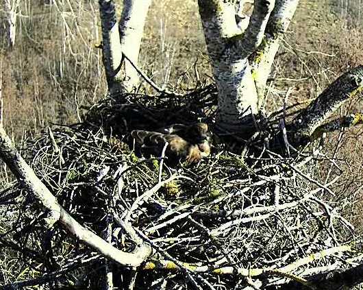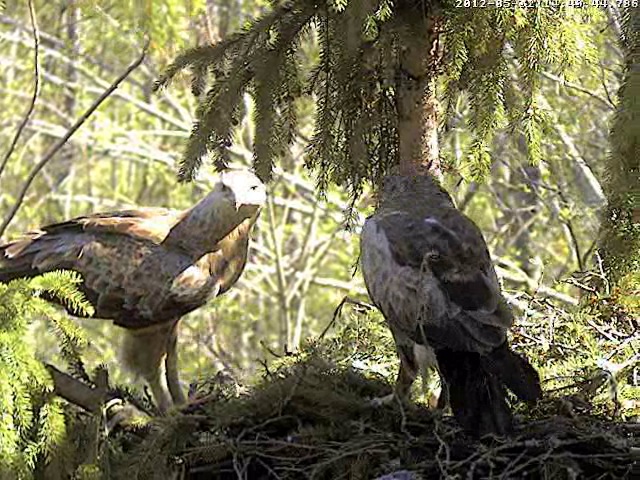 Kameras attēls tagad ir pievilkts tuvāk. Klijāntēviņš atnesa brokastis (peli vai ko līdzīgu), mātīte aizlidoja tās apēst kur citur. Tēviņš iekārtojās uz olas perēšanu uz dažām minūtēm, tad aizlidoja, un pēc minūtes mātīte jau bija atpakaļ. vlcsnap-2012-05-04-10h07m38s73.jpg vlcsnap-2012-05-04-10h07m...