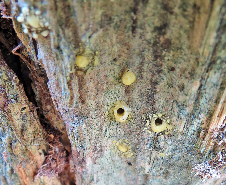 Ja te kāds vēl ieskatās - varbūt ir idejas, ar kā palīdzību radušies šādi sveķoti greznojumi kokā? Kāds kukainis?