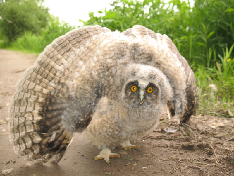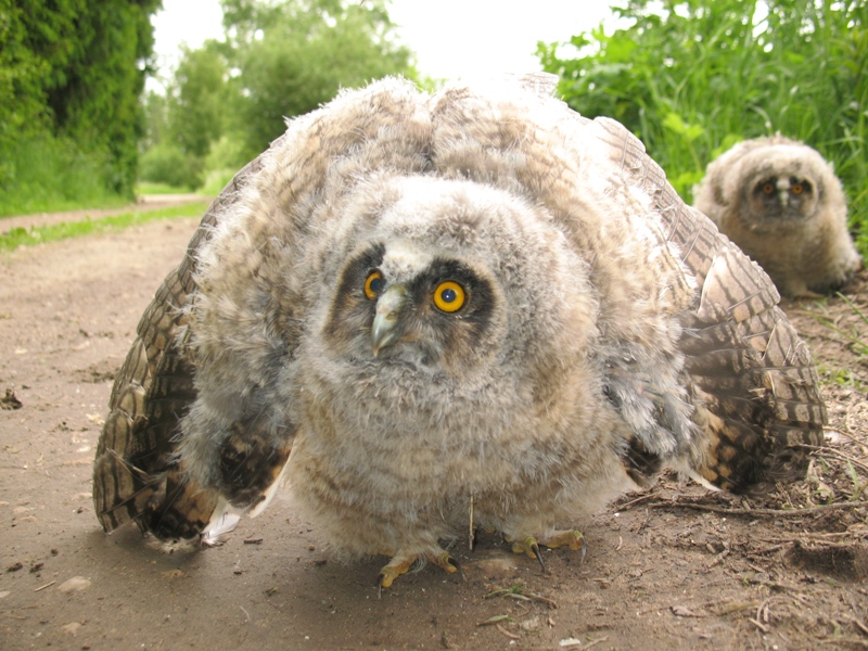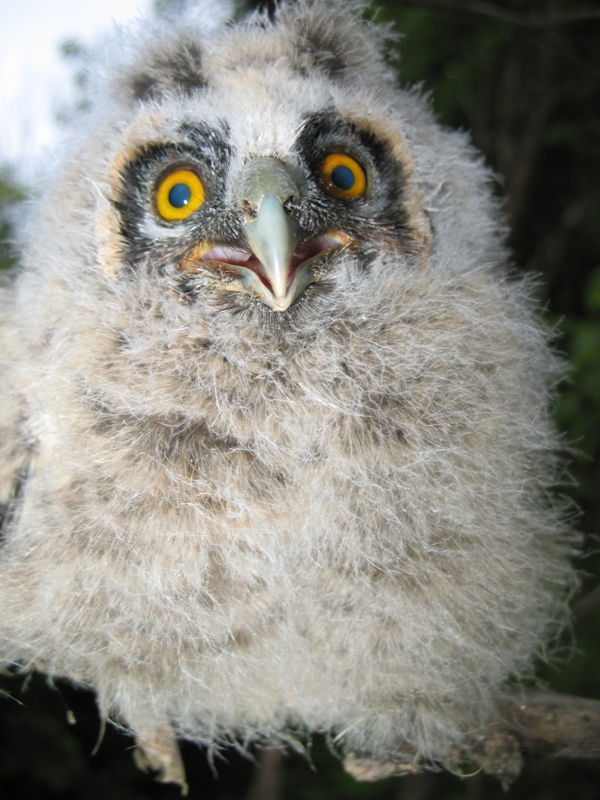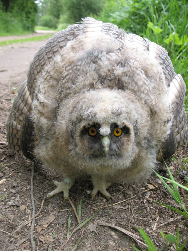 Šādi tipiski izpildās ausainās pūces mazuļi cenšoties iebiedēt iespējamo uzbrucēju (šajā gadījumā gredzenotāju). Viens no mazuļiem, kas iepriekšējā bildē. Meža pūcei šādu uzvedību esmu redzējis tikai vienu reizi, parasti gan arī tām gredzeno mazākus cāļu, kam vēl spalvas nav tik attīstītas.