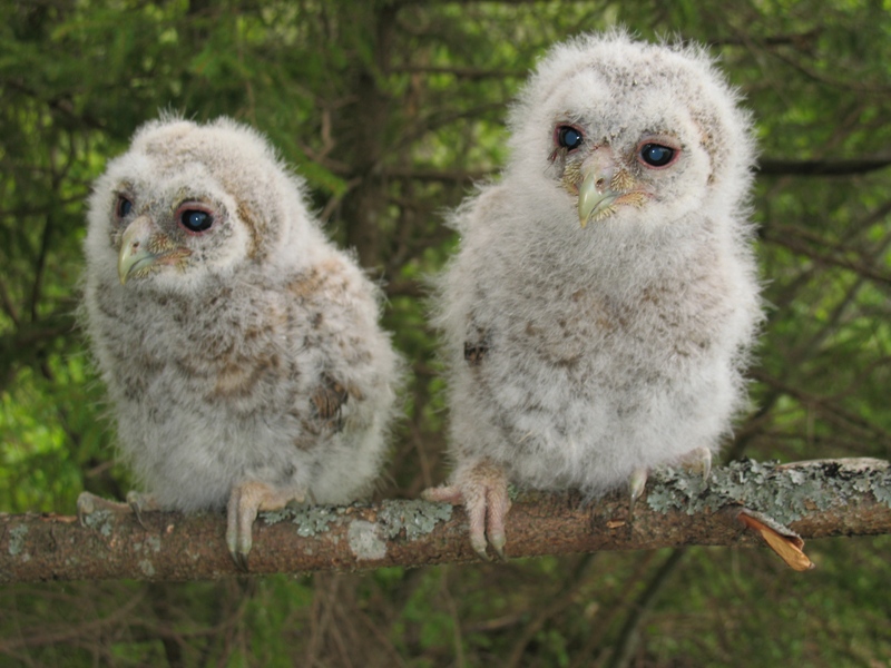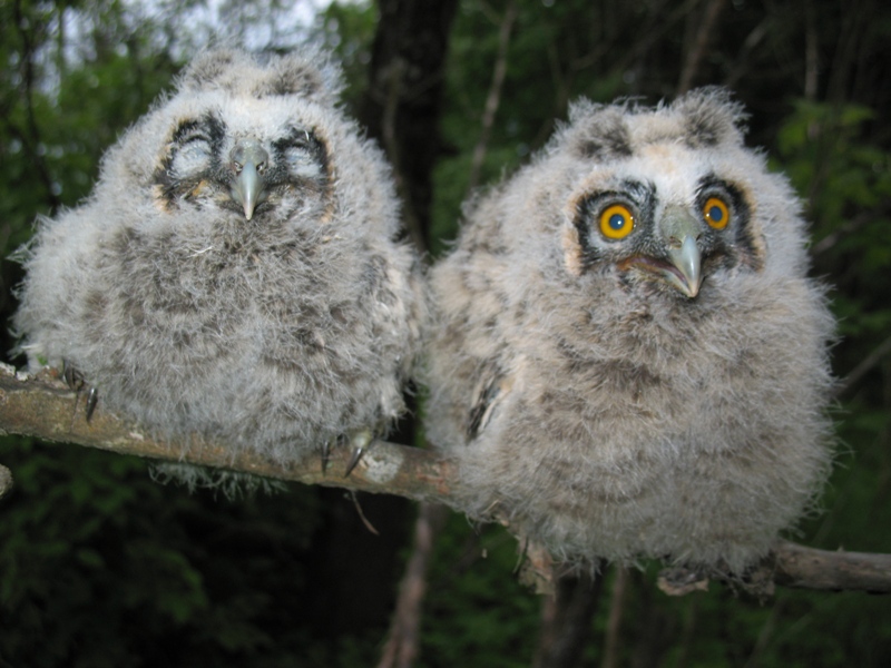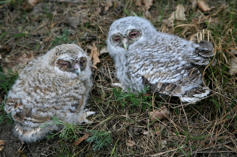 Ausainās pūču mazuļi. Izņemti no ligzdas gredzenošanai un uzsēdināti uz zara. Dabā tomēr tik mazi mazuļi vēl kādu laiku būs ligzdā. Šie bija vecā vārnas ligzdā ābelē, apmēram 4 m augstu Alūksnes apkārtnē.