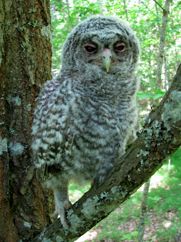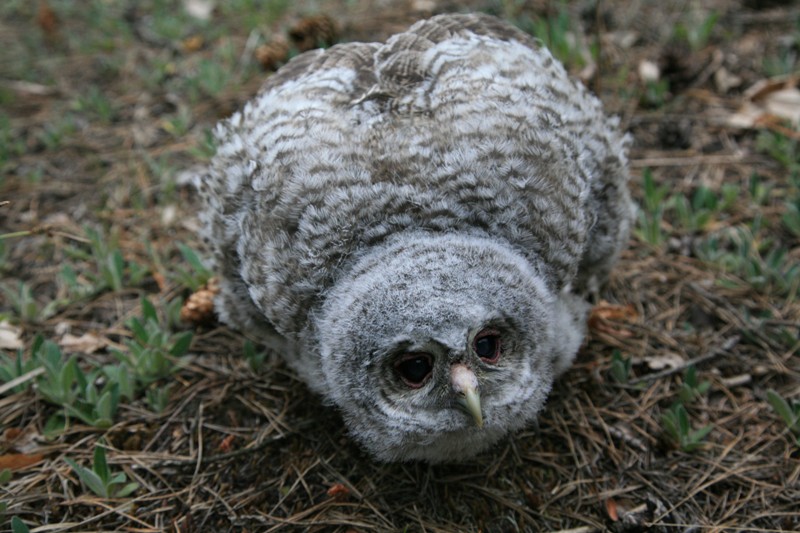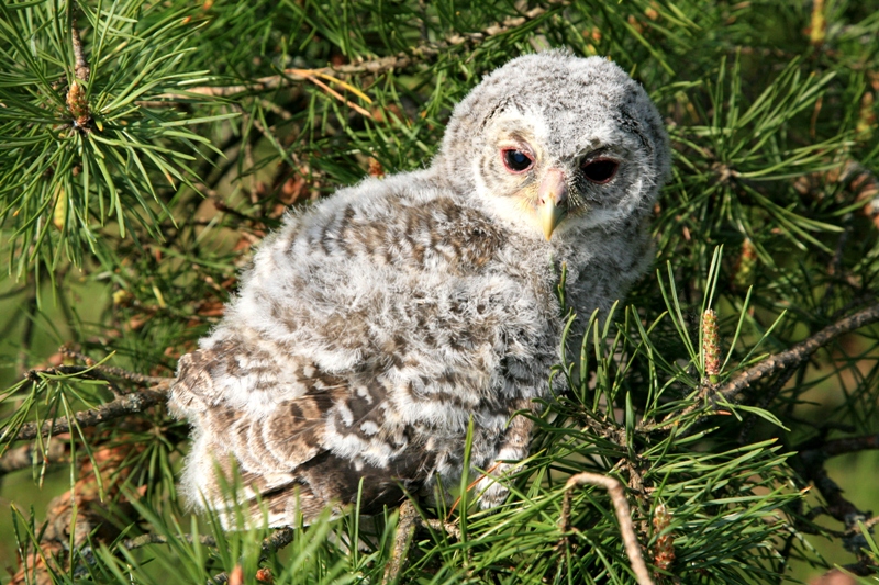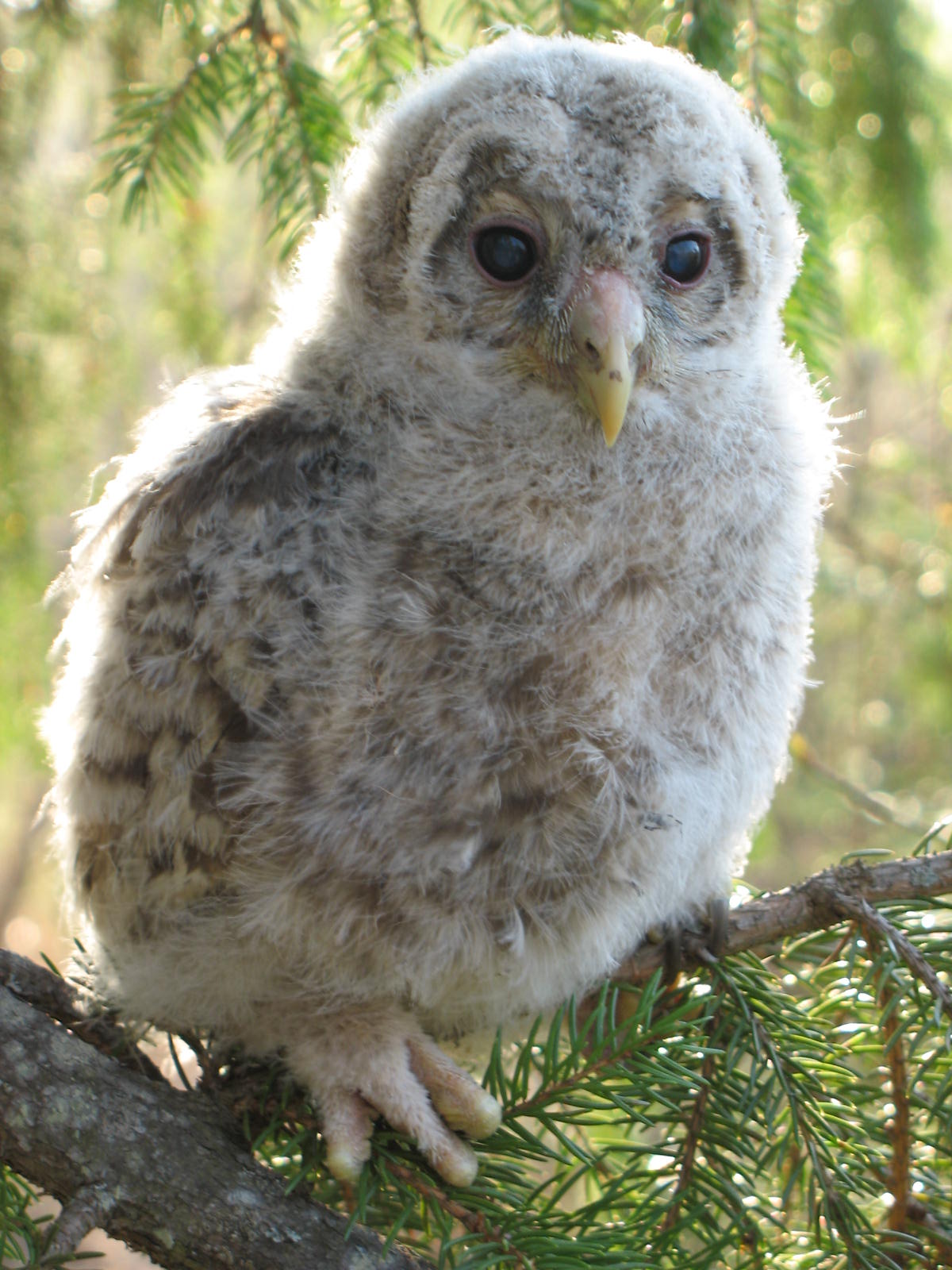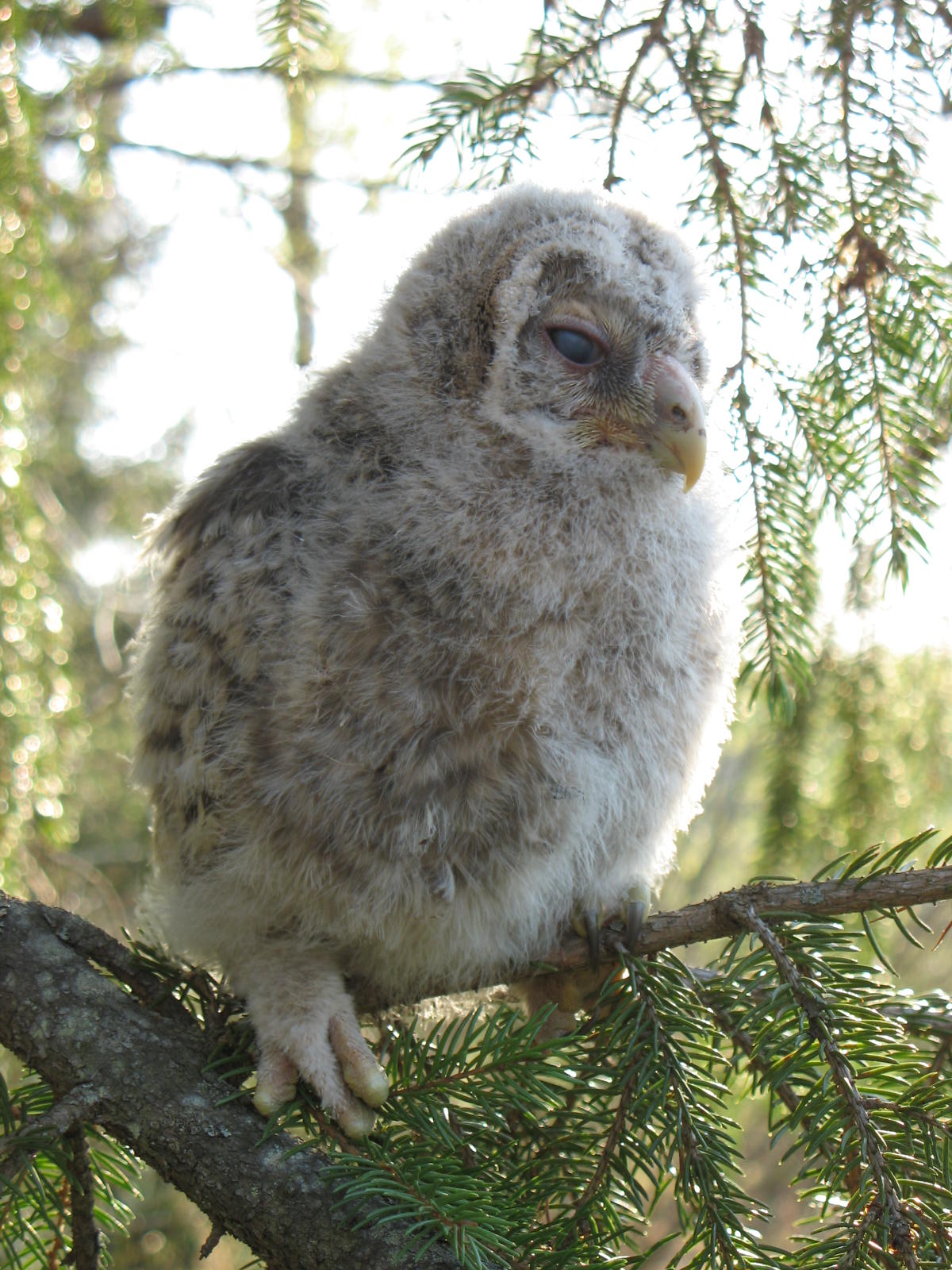 Meža pūces mazulis. Apmēram 40 dienu vecs vai pat vecāks. No visa perējuma noķert un apgredzenot izdevās tikai šo. Mazuļi arī reizēm dienas laikā izdot raksturīgo saucienu, šo tas arī nodeva. Bieži vien saucienus tie izdod, ja paprovocē pieaugušās pūces (arī tās dienas laikā iebļaujas). Tā uz dullo ieraudzīt kaut kur koku galos pagrūti, slēpjas kā partizāni.