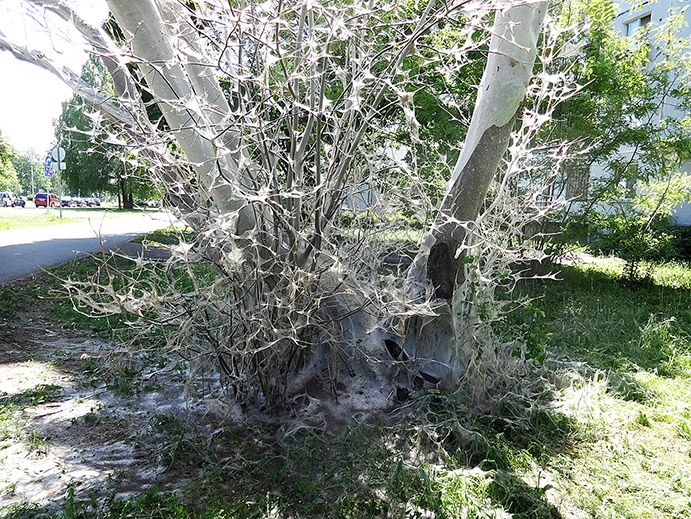 Kaut kādi kukaiņi noēdušas kokiem visas lapas, visi stumbri līdz zemei apvīti ar tīklu, lidzīgai zirnēkļu tīklam.