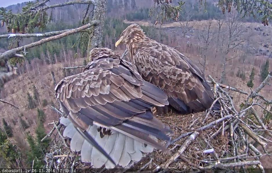 Hmmm... Zivjērgļi (Ilmārs, Monti), lai arī varēja redzēt, ka gaida vēl savu partneri, tomēr nesa zivi un pārojās ar meiteni, kas bija ieradusies ligzdā un tās saimniekam "sita kanti". Bet tad atlidoja īstās saimnieces un visas madāmas izdzenāja.