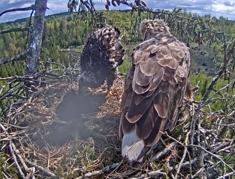 Apmēram 12.39:09 Roberts aizlido. Ja uzmanīgi skatās, tad aiz ligzdas, kameras centrā, ir divi egļu zari. Apakšējam zaram fonā ir koks. Tur Roberts (mazs putna siluets) ielido.