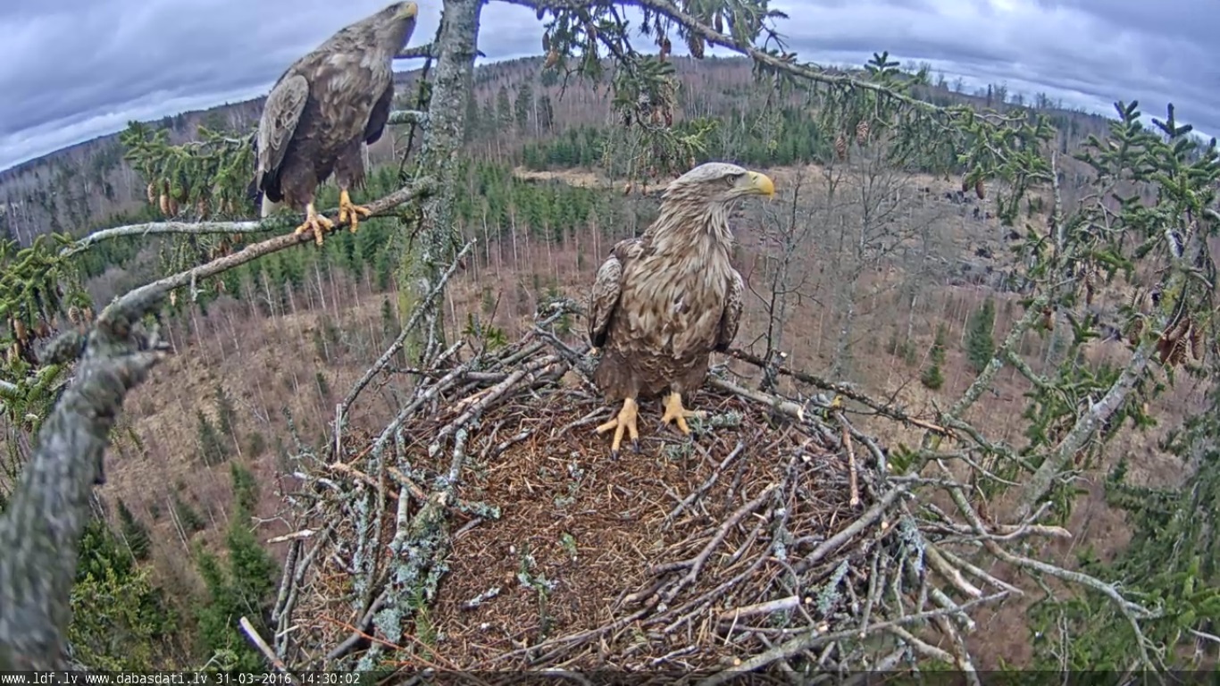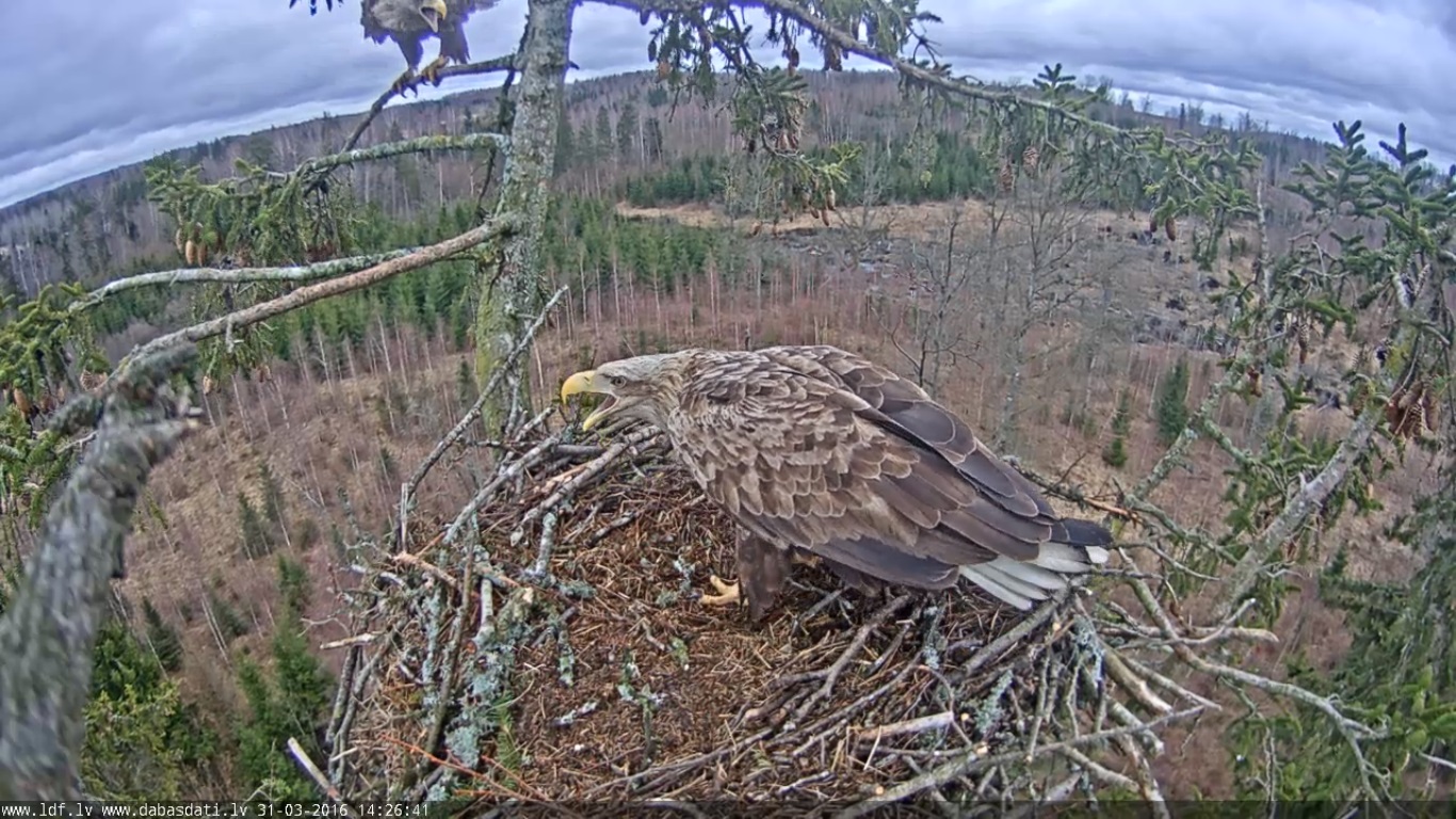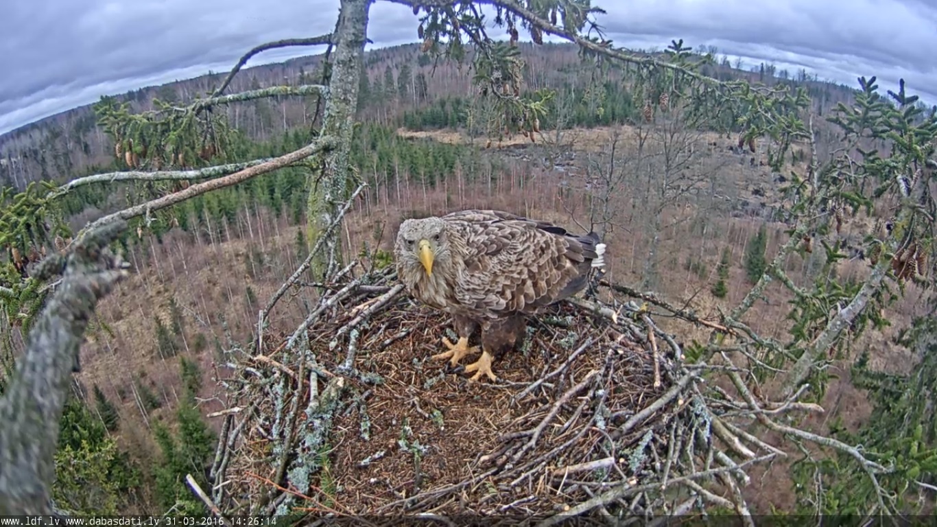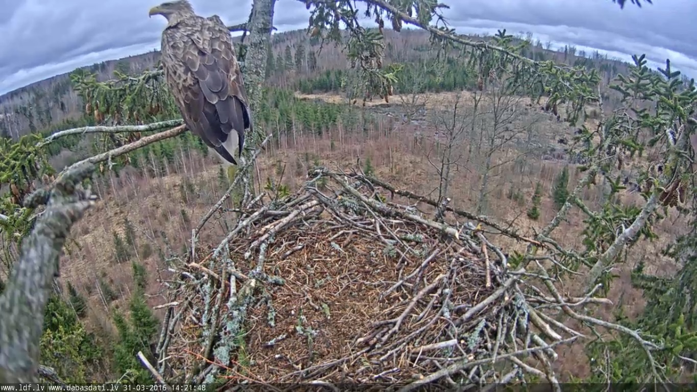 14:20 viens ērglis beidzot parādījies ligzdas kokā uz zara