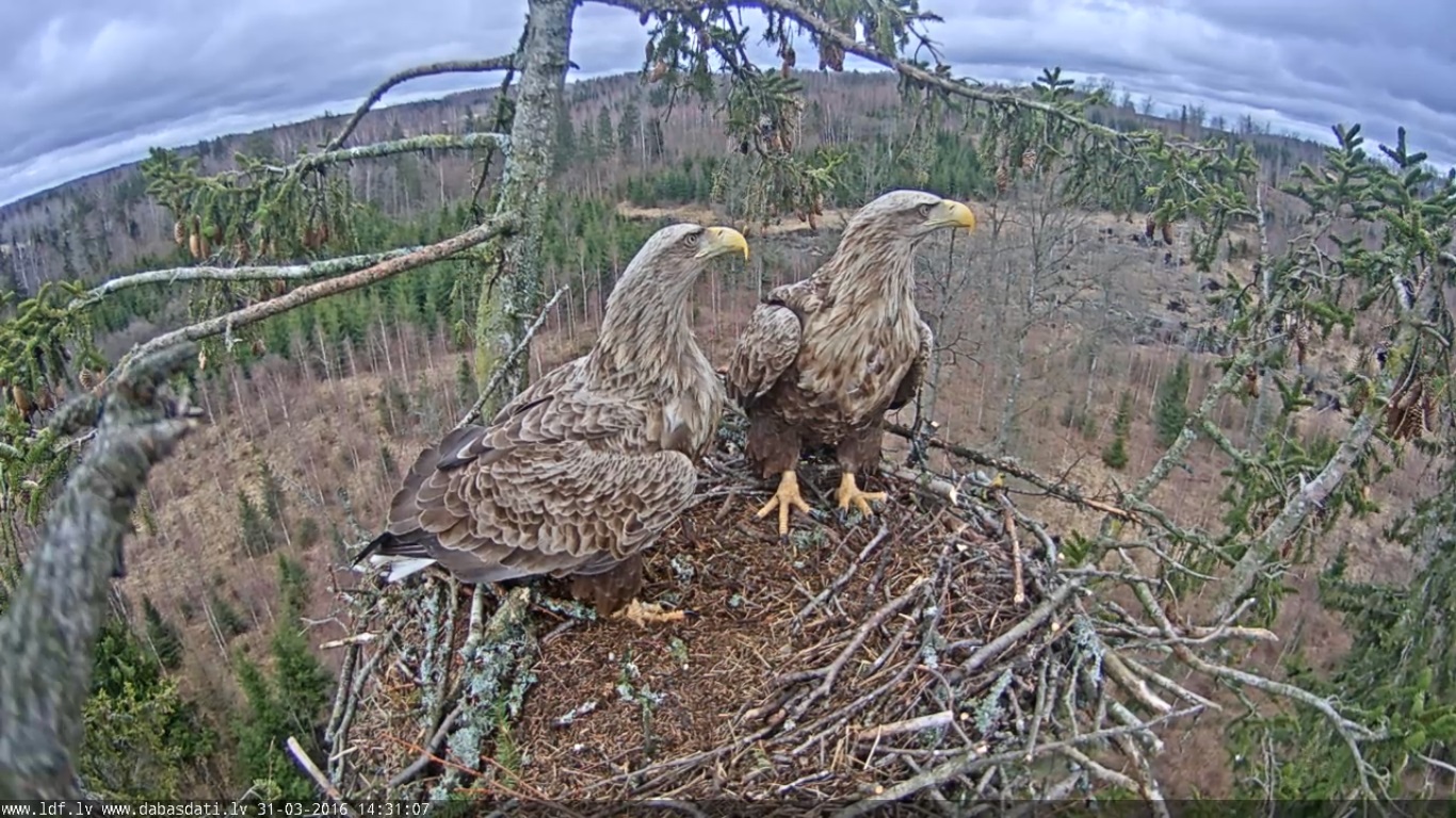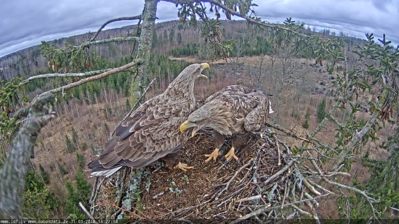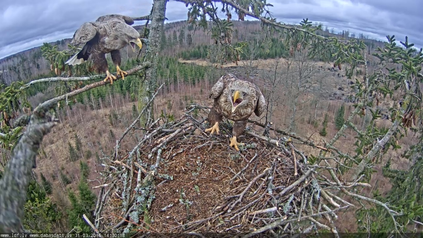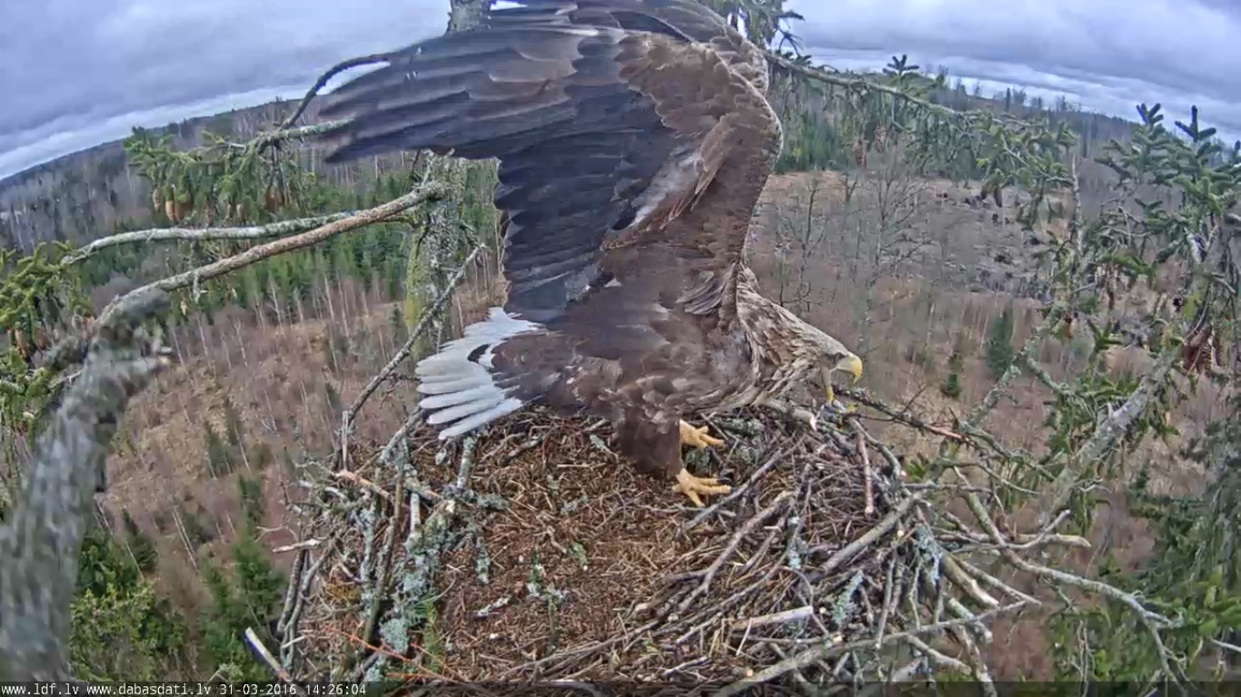 did i understand correct: do you think that the first eagle on the nest was a strange female? and then came Ansis? and then Egle chased the strange female away? (Google Translator was not very helpful...Vērotāja wrote:Man "uzkrita" cita lieta - tas ērglis, kurš ligzdā sēž sākumā, ir ar tumšāku galvu par abiem vēlāk ielidojušiem ērgļiem. Tā kā agrāk nekādas īpašas atšķirības Egles un Anša galvas krāsā nav manītas, varētu pieņemt, ka tas pirmais ērglis ir svešais.Sandra L. wrote:Vai nevar būt tā, ka 15:02 pirmais ērglis, kas ielidoja, bija sveša mātīte? Pēc tam blakus nosēdās Ansis (ja pieņem, ka tēviņi nekaujas ar mātītēm), bet Egle pa vidu lidoja un taranēja svešo prom no ligzdas. Man tur gan punktiņš, gan svītriņa izskatās.
