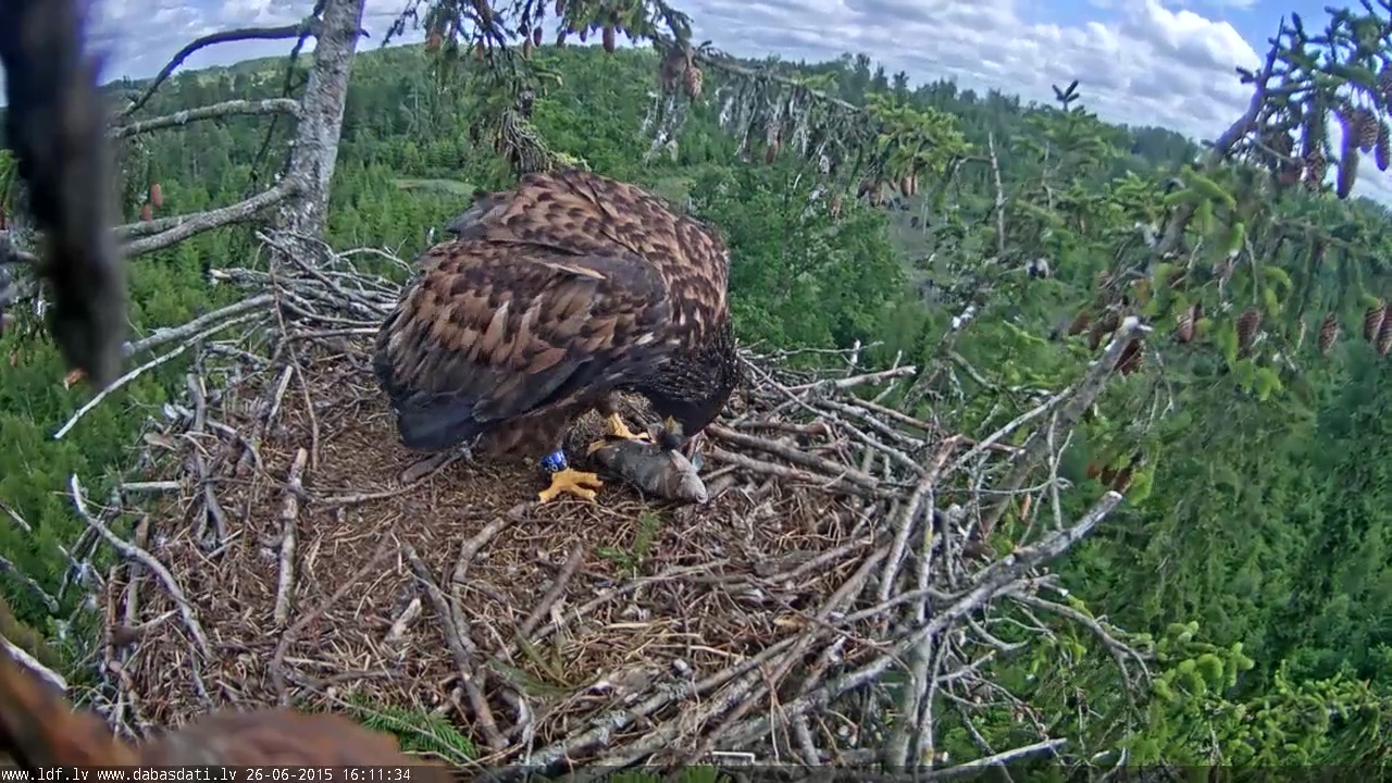 Izdevās noskatīties Durbes zivs piegādi no a- z. Zivi viņam atnesa 16.09. Veselas divas minūtes pēc tam viņš pat nepievērsa uzmanību zivij, bet sauca, skatoties uz to pusi, kur pazuda Durbe. Tikai 16.11 viņš sāka ņukāt zivi. Izskatās, ka viņš ir tādā interesantā vecumā- no ligzdas viņš visus dzen laukā aizstāvot to kā savu teritoriju, bet tanī pašā laikā vēl gribas kādu vecāka palīdzību pie barības sadalīšanas. Liels, bet mazulis.