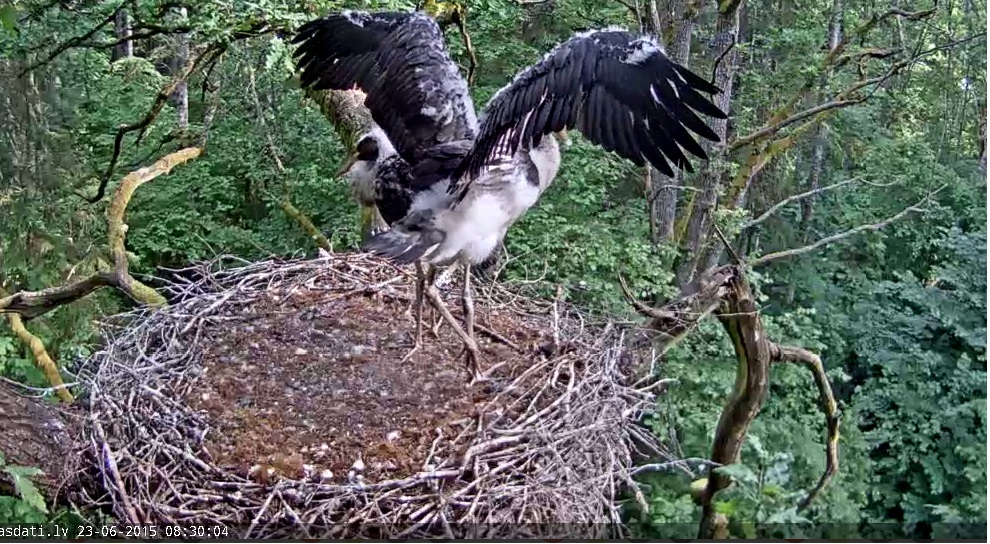 16:35 Labdien,visiem! Rādās,ka atkal viena lietaina diena šajā jaukajā ligzdā :( Abi divi Zīļuki galīgi samirkuši guļ ligzdā un skrubina viens otru ar knābjiem :roll: Vecākus tuvumā nemana,ja nu vienīgi uz kāda aukšējā zara noslēpušies :( Tagad mazie piecēlās izvingrināt kājas un paplivināt spārnus ;)