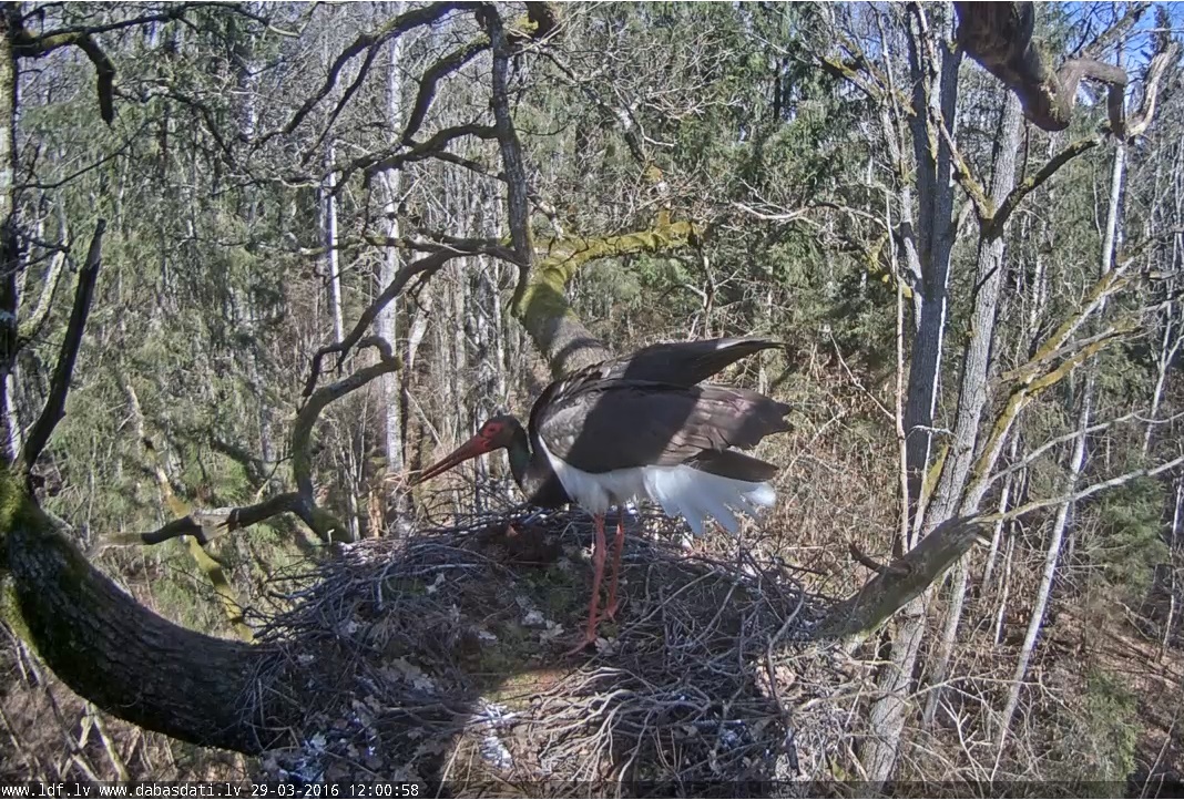 12.00 Viņš skatījās kaut kur augšā pa kreisi. Man šķita, ka viņš cerēja, ka būs klāt otrs no pāra, jo viņš sapušināja asti un dziedāja riesta dziesmu. Varbūt virs ligzdas kāds stārķis palidoja garām?