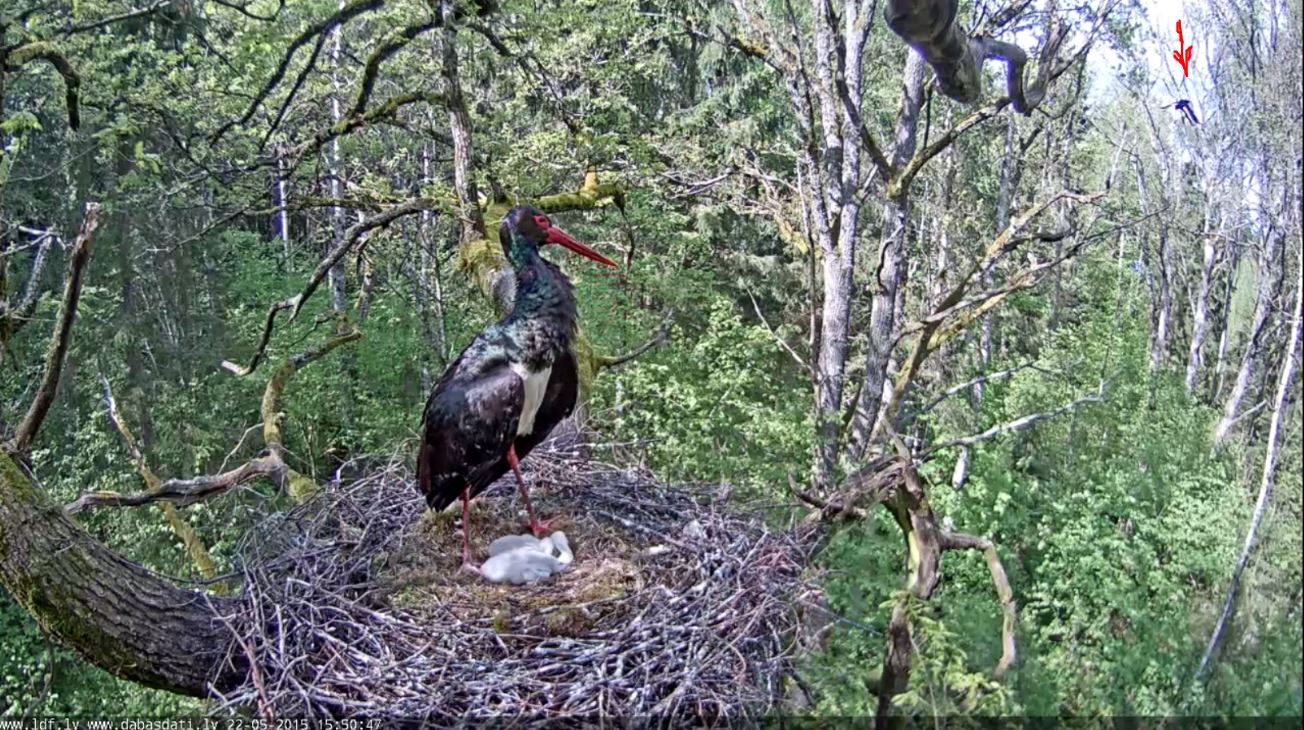 Ap 15:45 - 15:50 stārķis no kaut kā aizsargāja ligzdu - klabināja, spārnus iepleta, aizsargpozīcija, šņāca. Kaut kas arī pārlidoja pāri ligzdai, bet nepaspēju pamanīt, vai tas ērglis bija vai kas cits.