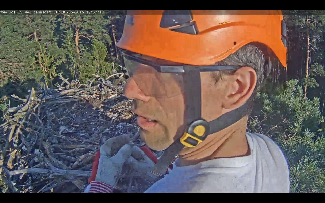 Aptuveni pēc stundas ornitologs A. Kalvāns gredzenos zivjērgļu mazuļus!