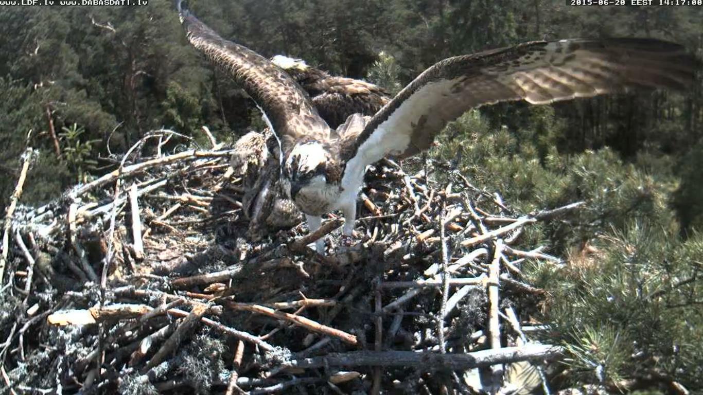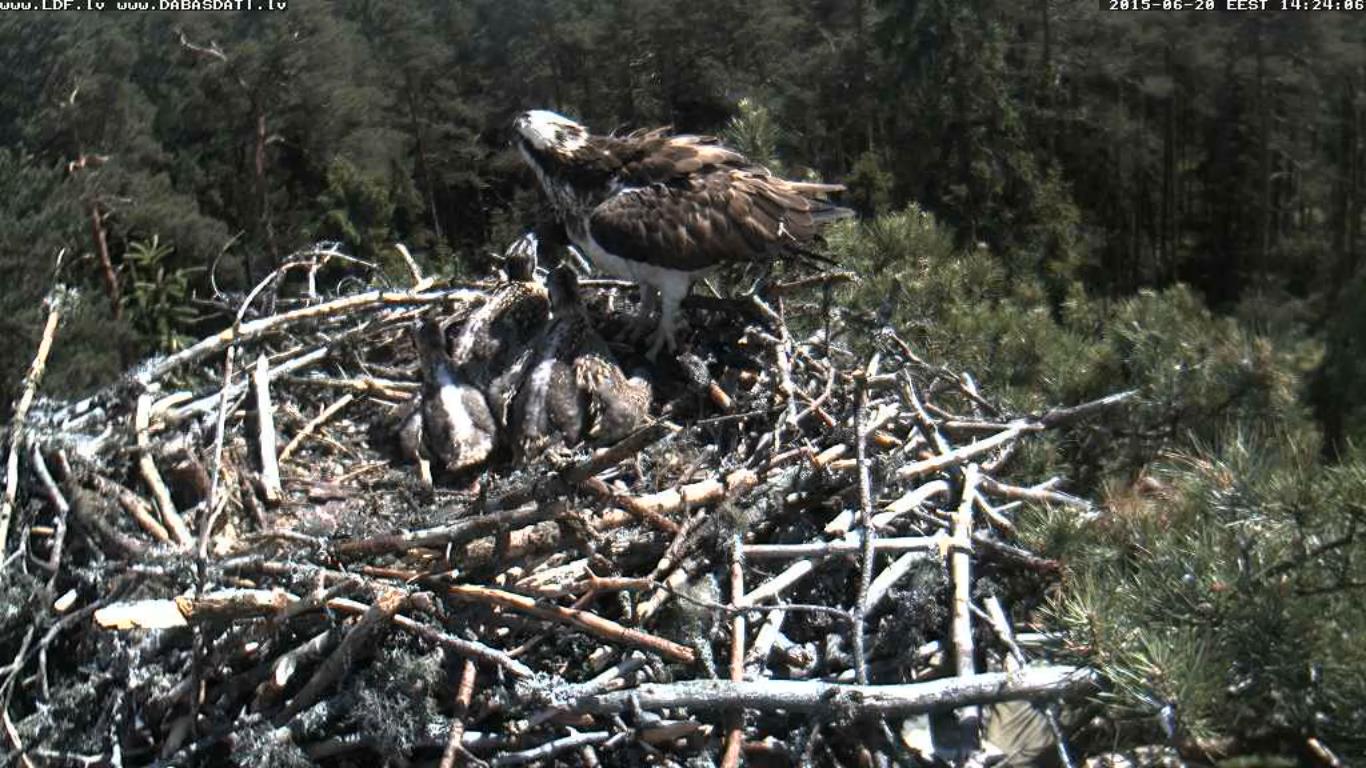 13.35 Brīdinājuma sauciens un Laimiņa izlido, mazie pieplok pie ligzdas. Pēc mirkļa viss atkal mierīgi