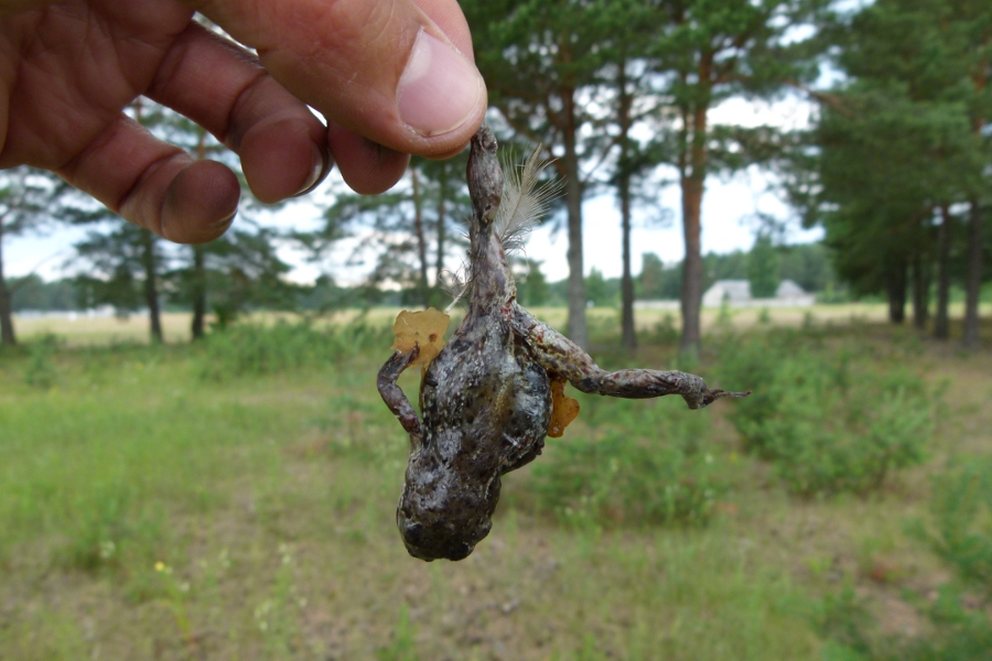 Te tas pats abinieks, jau izvilkts no z-mazuļa mutes, tad arī noteikts līdz sugai (30.06.2013., Ādažu poligons):dabasSkaņas wrote: Tā ka vardes ir OK. Gana saldas. Galvenais, lai nav par lielu. Jo tad z-cāļi var aizrīties. Kā ir dažkārt gadījies. Līdz tam, ka putnēns pagalam. Te ielikšu saulaināku piemēru, kad - tajā pašā Ādažu poligonā, tikai citā būrī - paspēju mazuli atbrīvot un izvilku viņam no rīkles tur iestrēgušu brūno varžkrupi. Var jau būt, ka iepriekšējās pieredzes satramdīts tomēr pārsteidzos, un cālis to glumo būtu beigās laimīgi norijis: