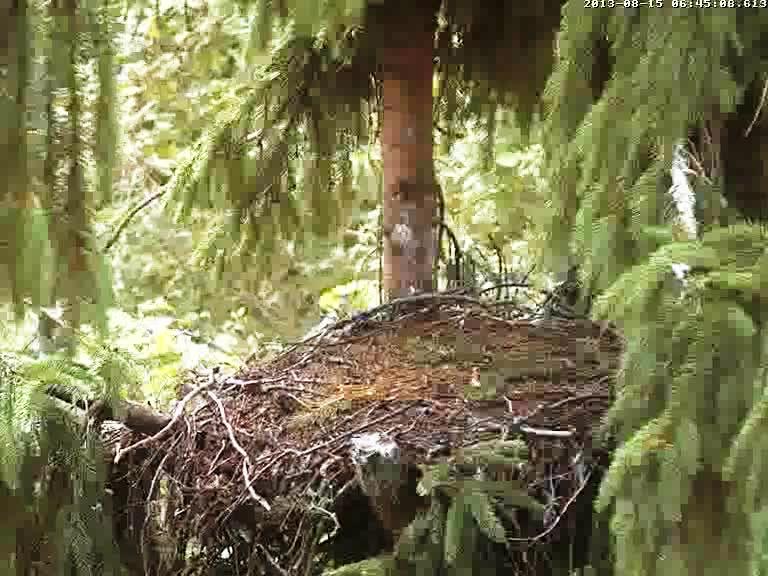 9.35 Mārcis sēdēja uz zara blakus ligzdai un klaigāja, otra balss izklausījās pēc Mačo. Kad papūta vējš, varēja redzēt Mārča plecu, bet bilde nesanāca, laikam nospiedu sekundes desmitdaļu par vēlu. 9.38 Mārča balstele attālinājās.