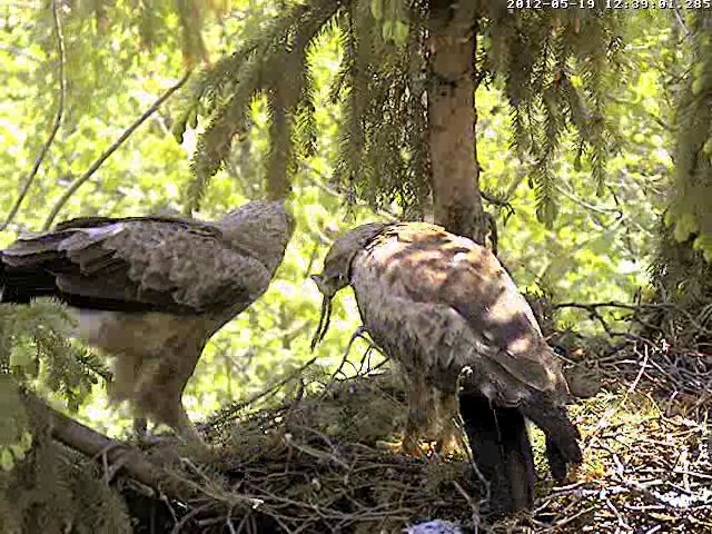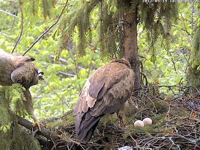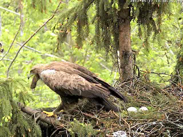 12:57 Mētra atpakaļ ar egles zariņu. Ielocīja gar olām, un uzreiz apgulās perēt. Auksts gan.