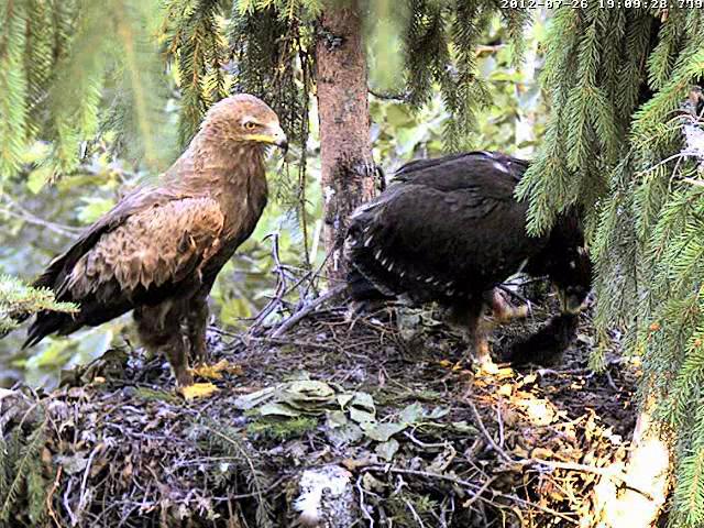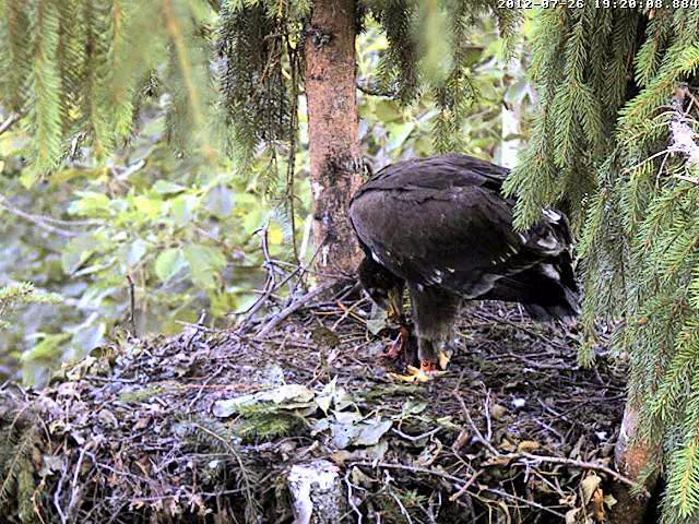 Kameru ieslēdza neilgi pirms 8. Kamēr grozījos pa virtuvi, dzirdēju, ka Mačo pielidoja (ap 8.03) un kaut ko atnesa, jo Miks klaigāja pa visu mežu, bet pašu nodošanas brīdi neredzēju. Nu jau minūtes 25 Miks to plosa un joprojām nevaru saprast kas tas ir. Pēc izmēra kā zebiekste, bet izskatās kā gaļas gabals bez ādas. 8.31 viņš norija pēdējo gabalu.