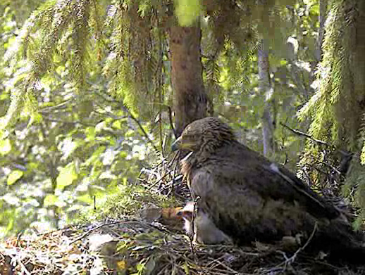 Aiz Mika var redzēt spalvu, kura izkritusi no Mētras kreisā spārna, vakar jau ļurkājās. Mētra nebija ilgi prom, ap minūti apmēram 8.28 Atgriezusies Mētra aizgāja līdz krājumu kalnam un sāka barot Miku