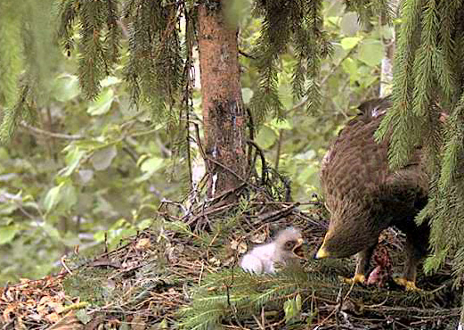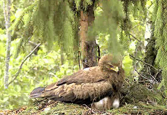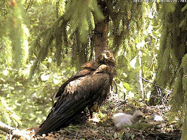 10.42 Mētru satrauca kāds, kas lidoja ap ligzdu - viņa ieņēma aizsardzības pozu un spalgi klaigāja.