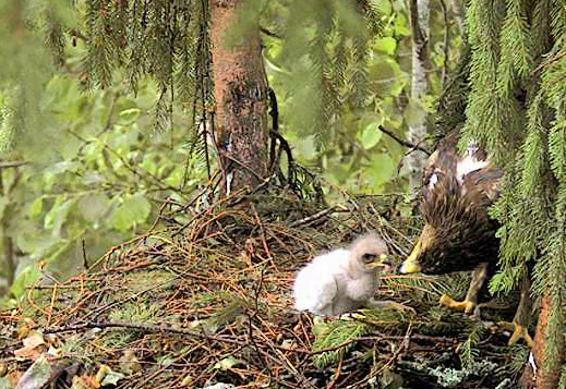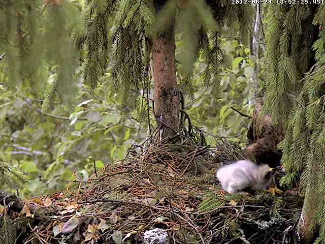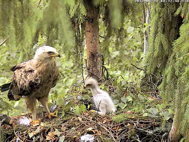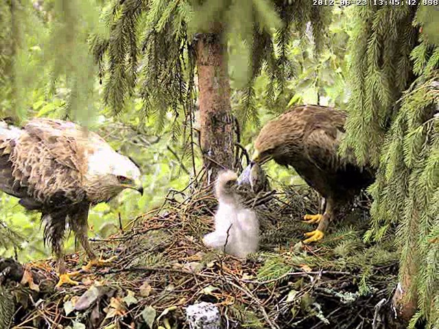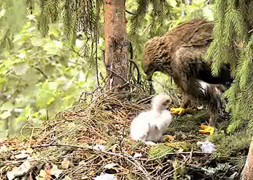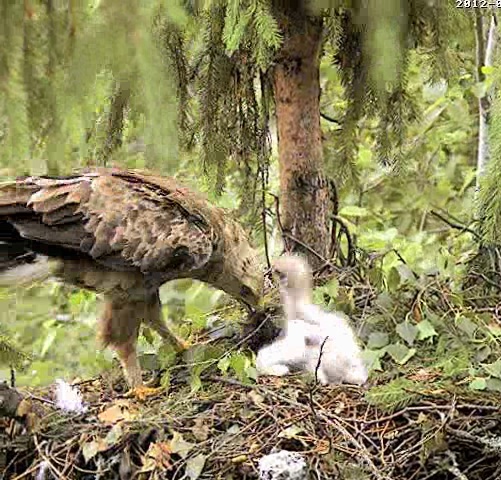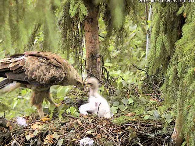 Tēvs paciemojās pie bērna un 9.36 aizlidoja, tuvumā var dzirdēt Mētru, kura ber treļļus. Laikam abi satikās kaut kur uz zara pie ligzdas.