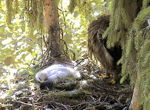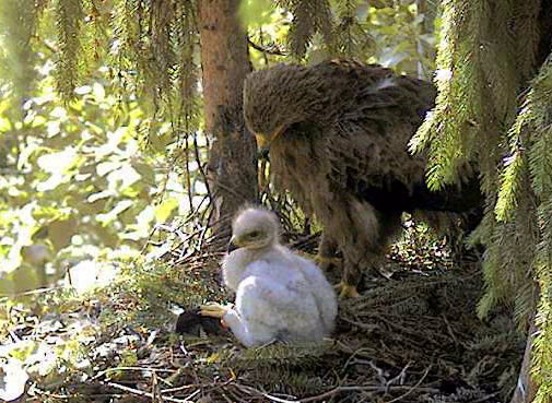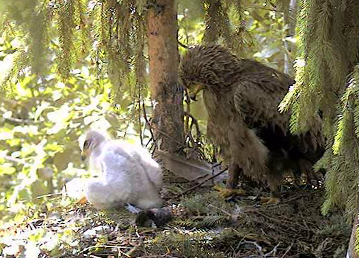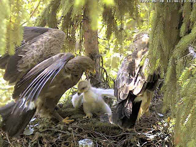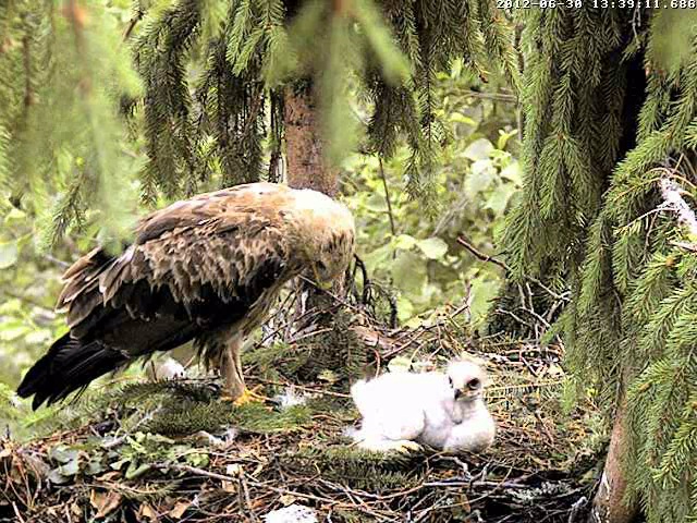 13.39 ligzdā ielidoja Mačo, bez ēdiena. Atlidoja apraudzīt savu lolojumu. 13.45 tētis uzleca uz zara Mazais palika gulēt kā tāds plācenis