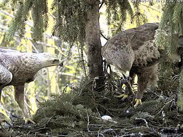 Mačo urda nemiers, 20.15 vēlreiz atlidoja ar zaru. Nolika to uz pašas ligzdas malas un tā kā stiepās apskatīt olu. Mamma uztupās virsū un negribēja, lai Mačo tuvojas. Tā arī nepiegājis tuvāk viņš brīdi pasēdēja un tad aizlidoja.