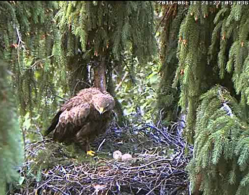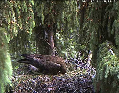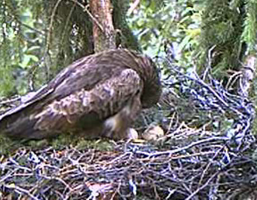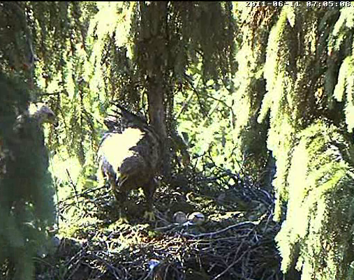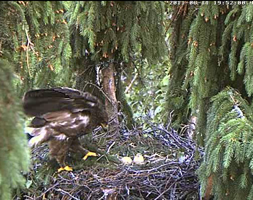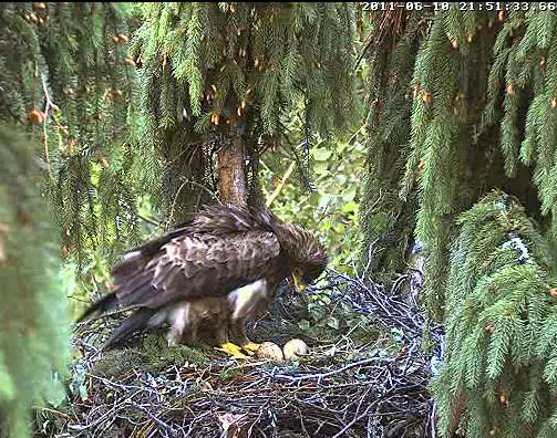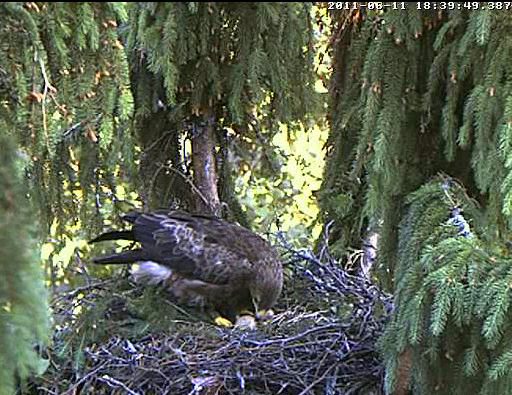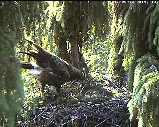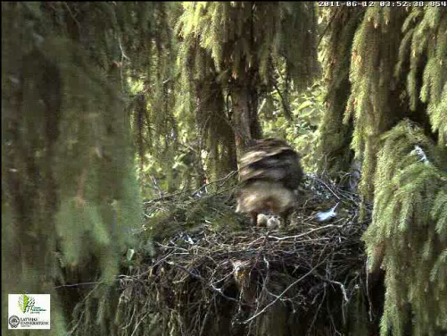 Nervozais kaimiņš strazds neizturēja ērgļu rosīšanos un 10.20 aizlidoja. Kā vienmēr - no labā stūra uz kreiso, pāri Mētras ligzdai.