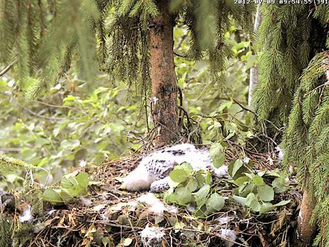 15:25 Pēc gardas maltītes - laiska atpūta. Mika izstiepies gulšņā. Mamma blakus, iepletusi spārnus, taisa ēnu. :)