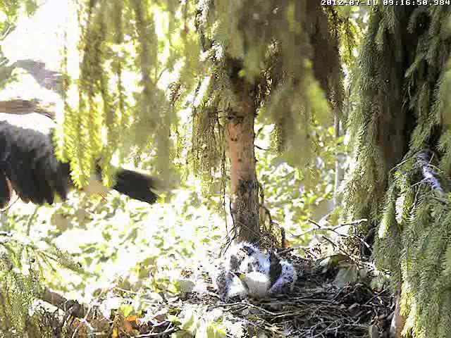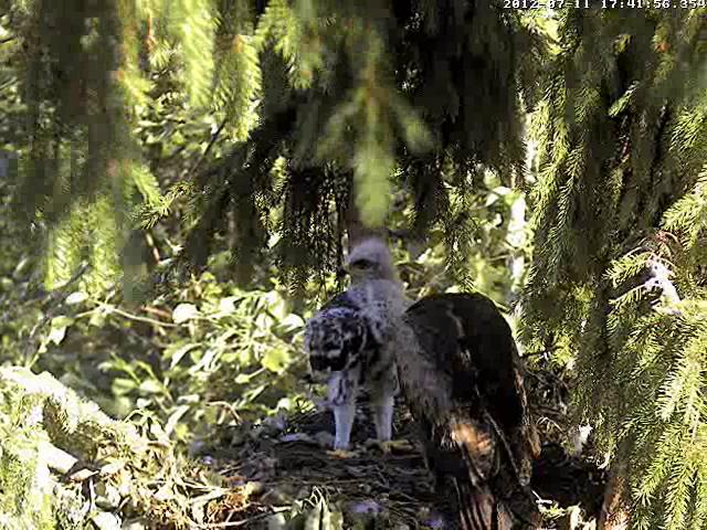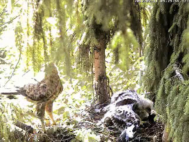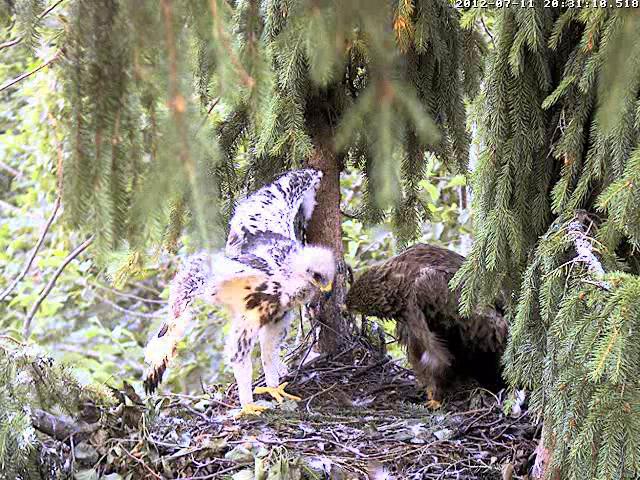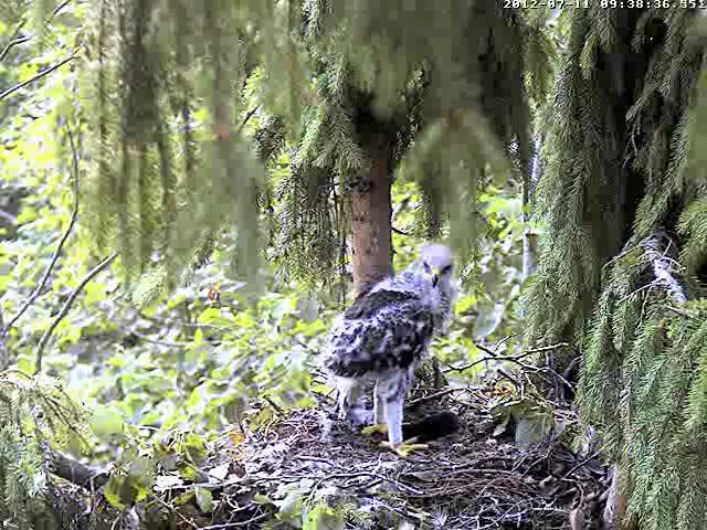 Kreisajā pusē ir iegūts mazs gabaliņš zara, uz kura šodien tāpat neviens neuzturas. Vecāki, ja sēž uz zara, tad sēž tālāk, bet Miks pagaidām neatstāj ligzdas robežas un tuvākās pāris nedēļas to nedarīs.