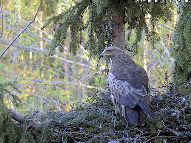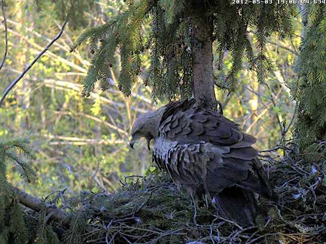 9:36 - 9:43 Mētra bija izlidojusi no ligzdas. Viss sākās ar viņas saucienu skanējuma izmaiņu uz augstākiem un garākiem toņiem; it kā skatījās kaut kur augšup, tad piecēlās kājās un spārnus tāpat neatlocītus nedaudz patirināja (zīmējās?). Tad aizlēca uz blakus zaru ārpus kadra, kādu brīdi tur patupēja, pabļāva, pēc tam aizlaidās prom. Mačo ligzdā netika manīts.