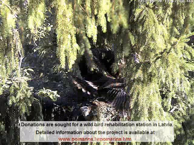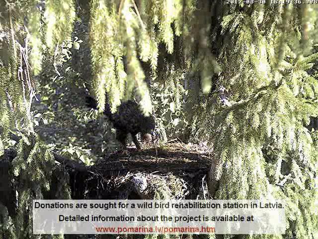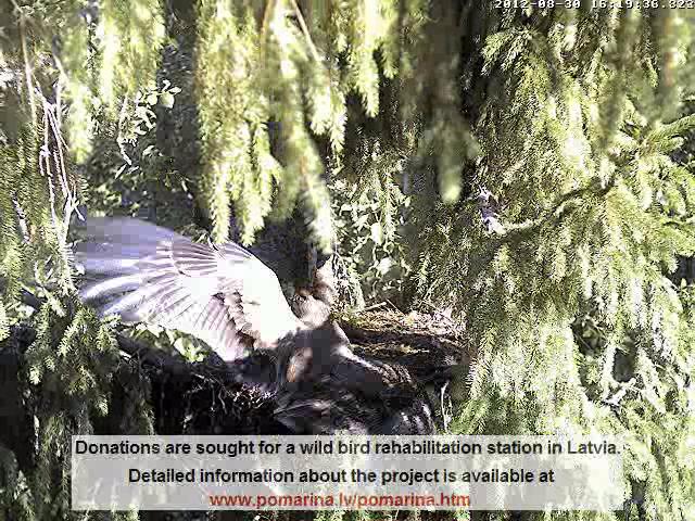 17:02 Atkal viens no vecākiem ar medījumu nupat ielidoja ligzdā. Saule spīd tā, ka neko nevar redzēt. Šķiet, ka Mačo. Miks kaut kur tālu klaigā. Izskatās, ka medījums ir paliels, un Mačo aicina savu dēlēnu. Mazais laikam labi paēdis, nemaz nesteidzas uz ligzdu. Mačo turpina sargāt guvumu.