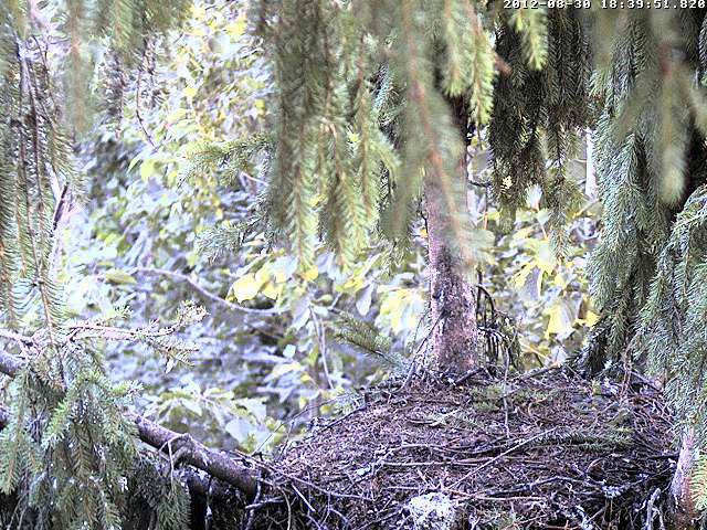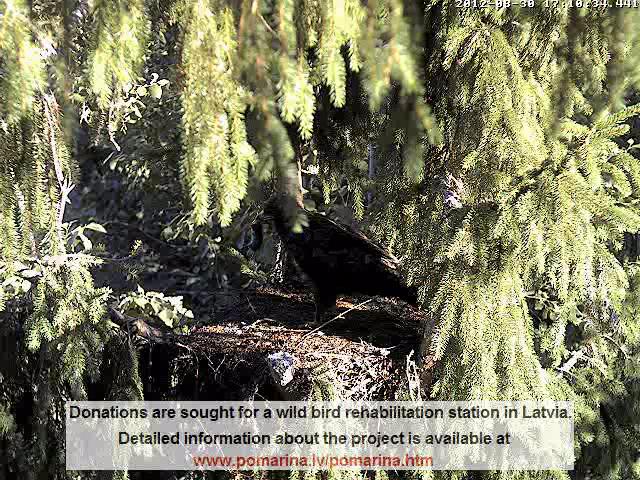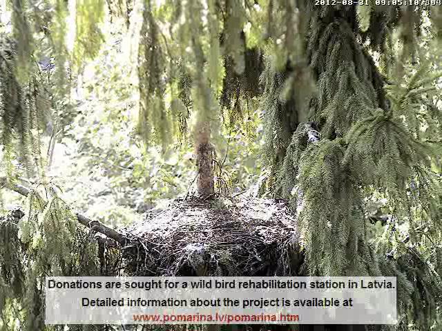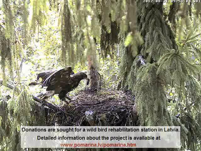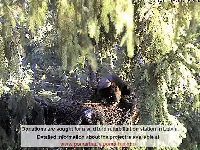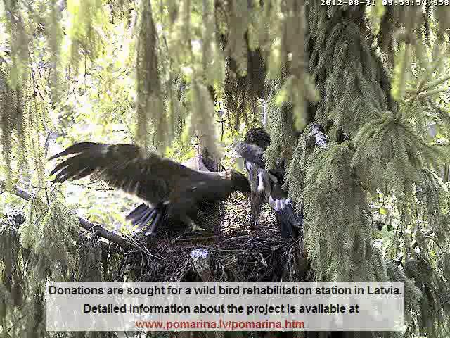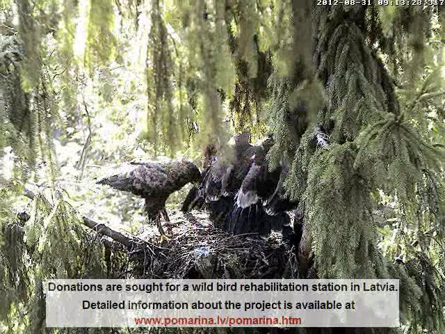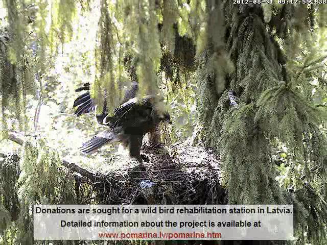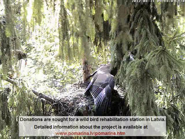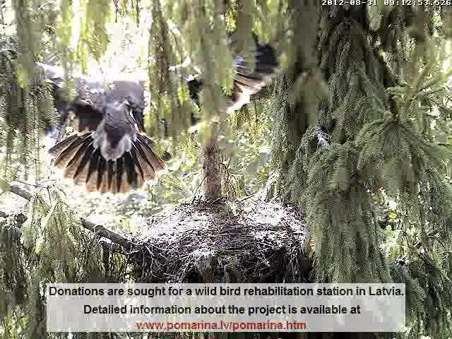Izskatījās, ka Miks ielidoja ligzdā ar kaut ko ķepā. Vai pats nomedījis. Tūlīt parādījās slapjš vecāks ( nevarēju saprast, kurš ) ar vardīti, lidinājās šurp un turp. Miks ēd savu " medījumu ".