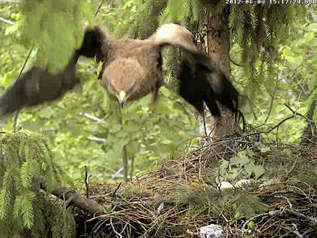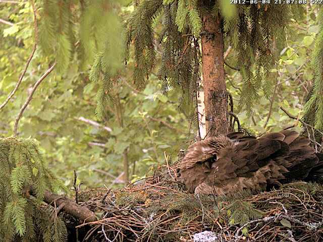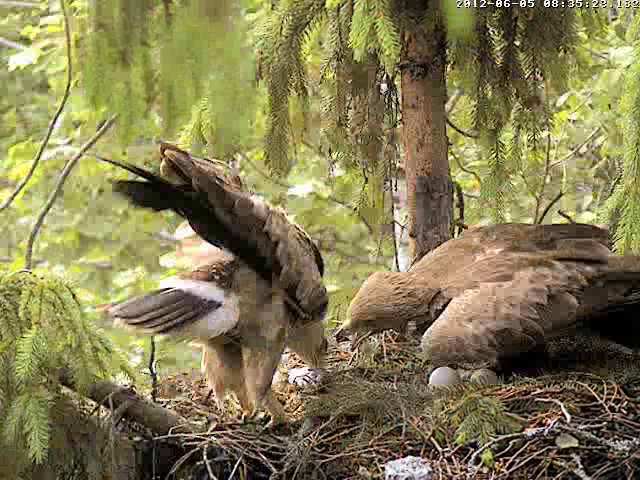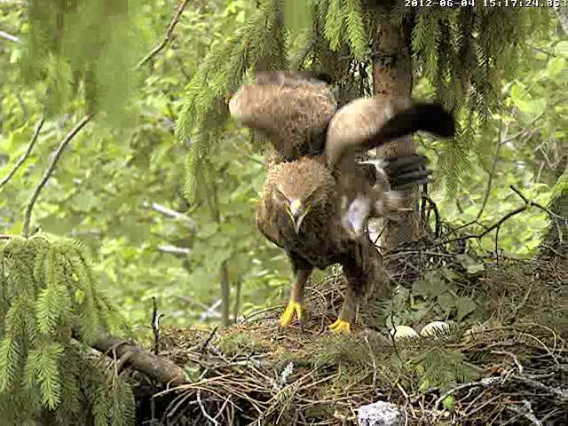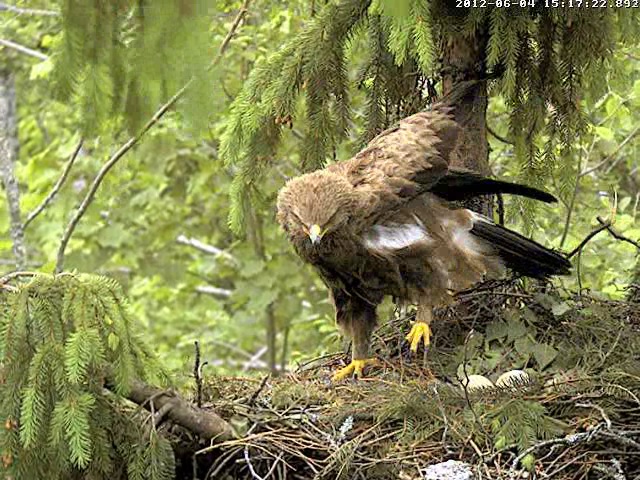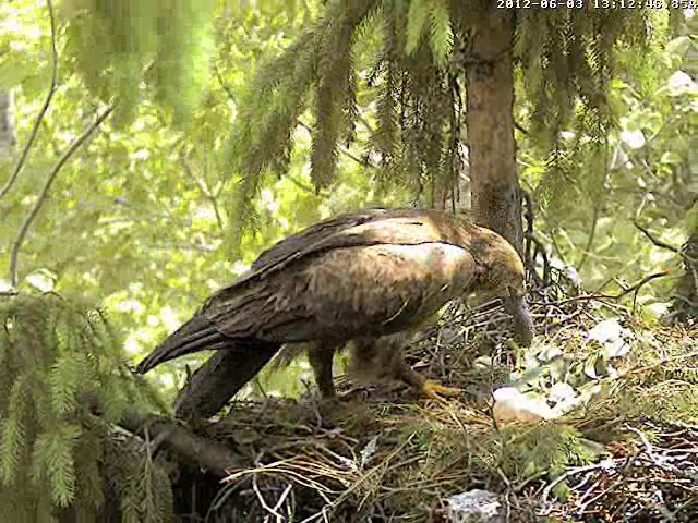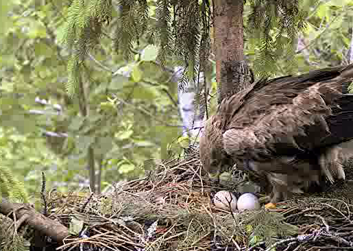 13:23 Mētra atpakaļ ar egles zariņu, ko ieloka ligzda. Un atkal turpina perēt.