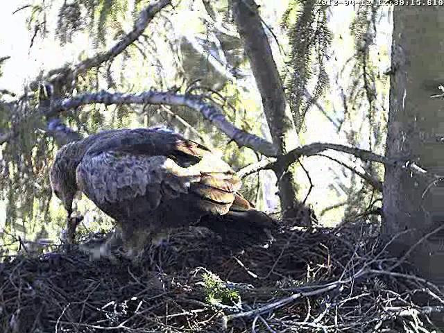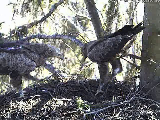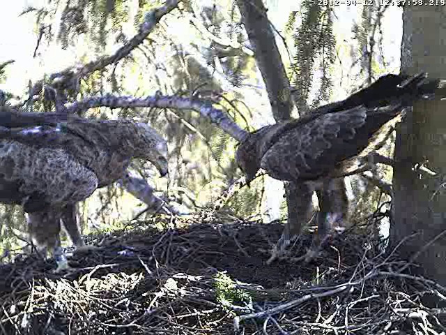 Mazo ērgļu mātīte ieradās 11.aprīļa pēcpusdienā, bet 12.aprīlī 12.37 ligzdā satikās abi ērgļi