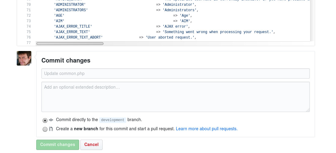 Kad ir izdarītas izmaiņas, tad var spiest "Commit changes" zaļo pogu.