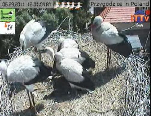 Tagad ligzdā drūzmējas seši jau lieli stārķi (mammīte kreisajā pusē). Jaunie ligzdā vēl pavadīs aptuveni divas nedēļas.