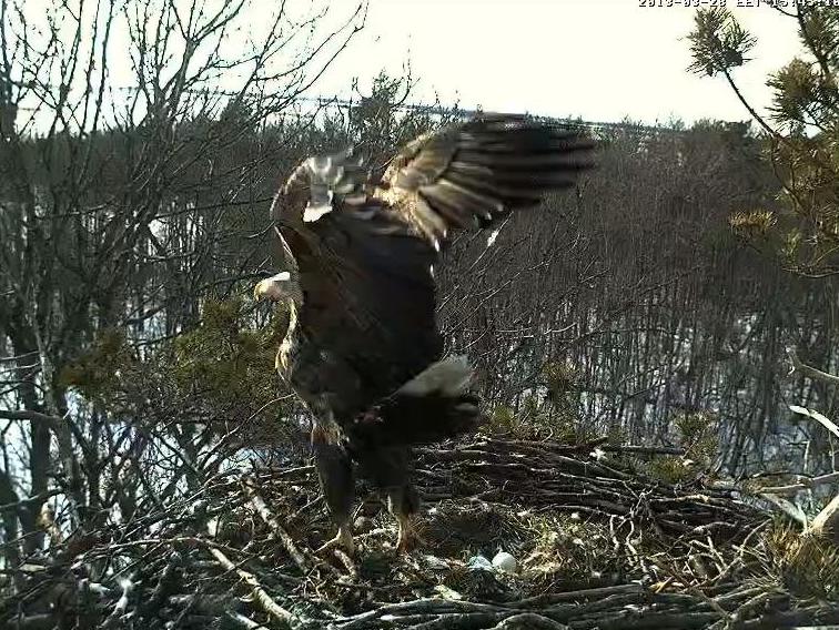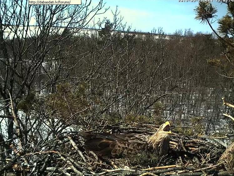 Šodien Sulevam bija nemierīga perēšana - vispirms ligzdas tuvumā ķērca kovārņi, tad kaut kas brakšķēja zem ligzdas, kadrā neko redzēt nevarēja, iespējams, ka gāja liels dzīvnieks. Sulevs par to satraucās, pieleca kājās un skatījās