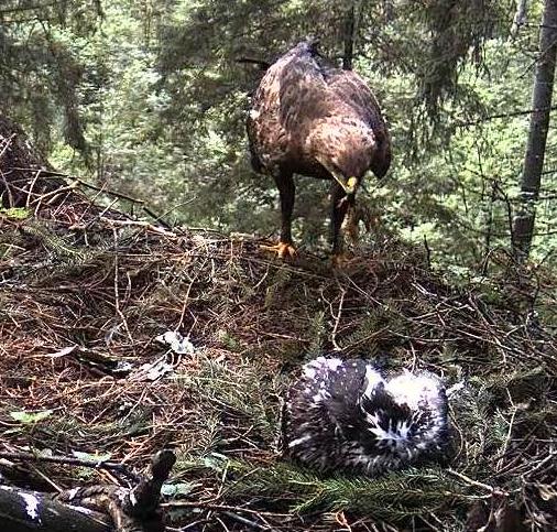 11:14 atlidoja Remo, bet šķiet, ka medījums aizmuka, jo viņš kādu brīdi cītigi kaut ko meklēja ligzdas sānu zaros, par izcēla gabalu, tad meta mieru un aizlidoja. Stefītis palika čīkstot.