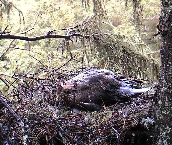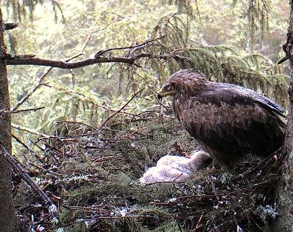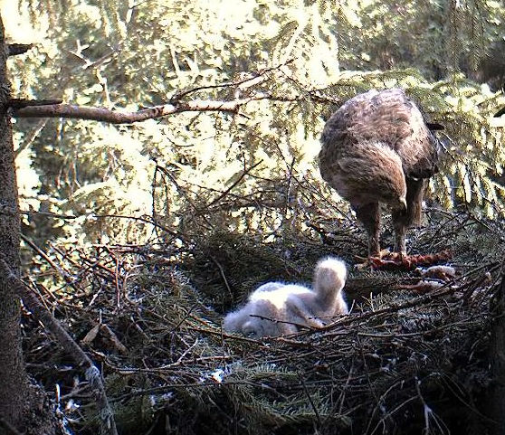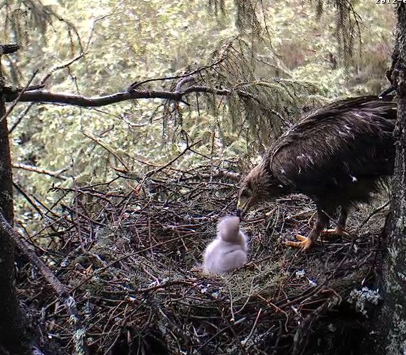 10:47 Koits atnesa kārtējo putniņu. Izskatās, ka Kalevam tie ļoooti garšo, viņš centās atņemt mammai medījumu, tāpēc Ehai nācas nekavējoties viņu barot.
