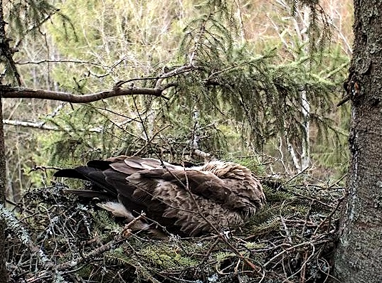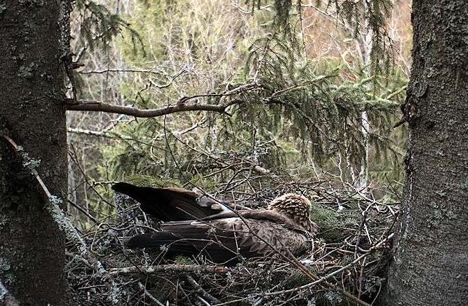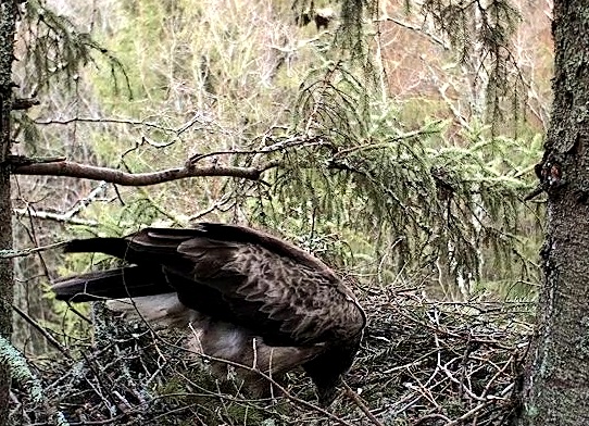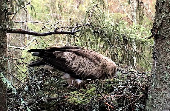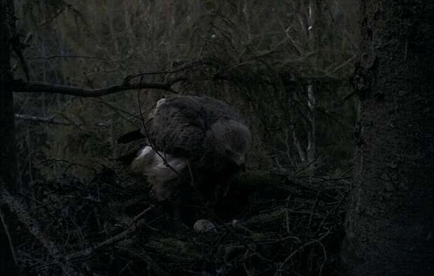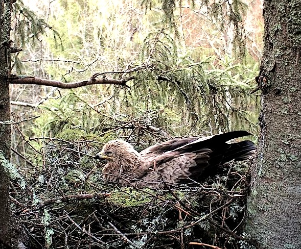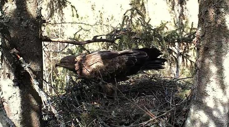 medījums ielīda atpakaļ ligzdas zaru biezoknī un tajā brīdi to vietu tieši apspīdēja saule, tāpēc pazaudēju to no redzes loka. Būtu interesanti sagaidīt. Svētdien Tuule līdzīgā situācijā uzreiz atrada atstāto medījumu.