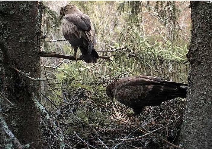 Redzēju abus ap 9.40, pirmajā bildē Koits sēž kokā netālu no ligzdas, centrā, pašā augšā.