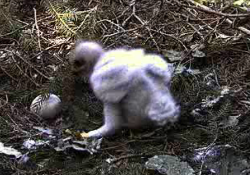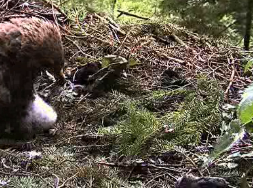 10.38 atlidoja tētis ar vardīti Tormi izdomāja, ka grib ēst, tāpēc vardi pārnesa sev tuvāk un sāka staipīt. Prasmes medījuma saplēšanā vēl nav, tāpēc mazajam nekas neizdodas Ap 11 Tormi saprata, ka paša spēciņiem pie kārotās vardes netikt, kādu brīdi skumji to vēroja, tad aizgāja uz ligzdas vidu gaidīt mammu