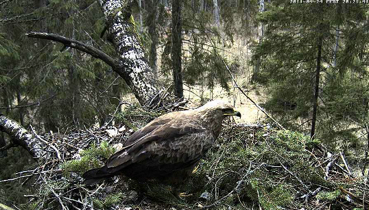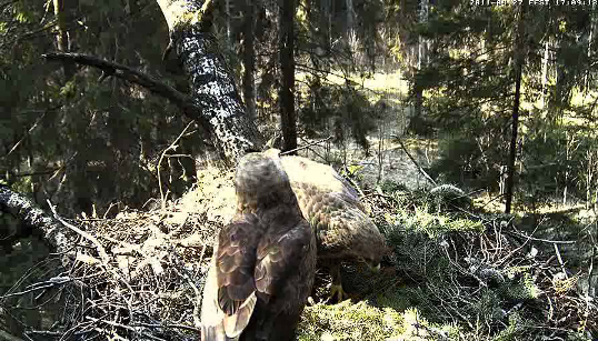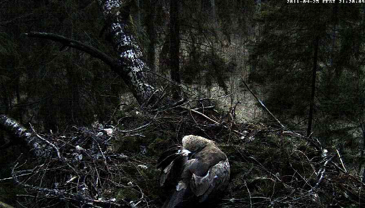 Ligzdā ielidoja tēvs ar ēdienu, bet šajā kamerā grūti uztaisīt bildes kustībā, tā ir ļoti lēna, kadri sanāk izsmērēti... Abi ērgļi pabiedrojās, mātīte palika nakšņot ligzdā