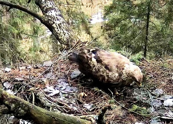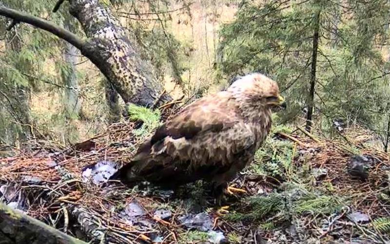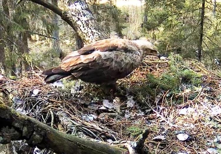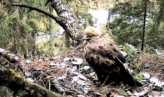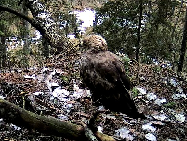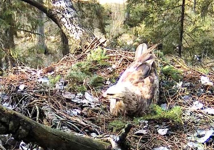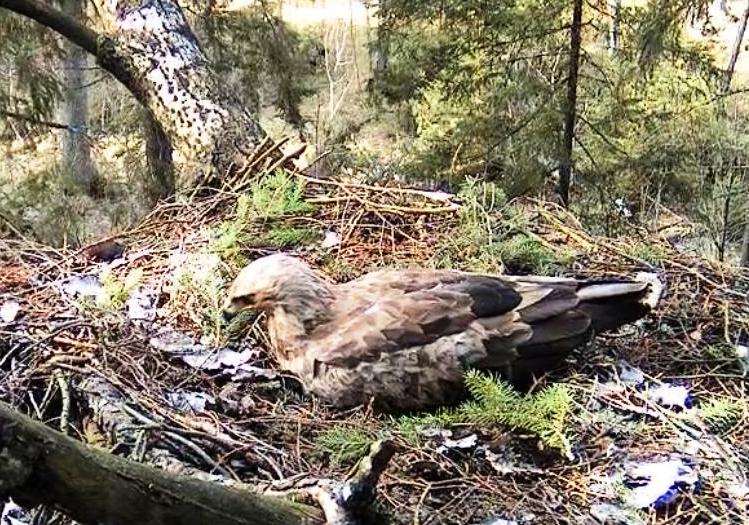 Šorīt ap 9.40 ligzdā ieradās Tūle, uzturējās tur vairāk kā stundu, klaigāja, kārtoja ligzdu.