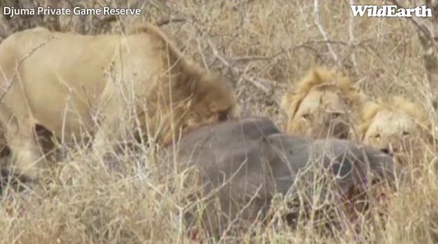 Ēd tikai viens, pārējie lauvas atraduši ēnainas vietas un atpūšās. Viņiem laba diena - daudz ēdiena no tā bifeļa sanāca, visiem vēderi pilni.