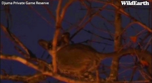 Pēc saulrieta lielos dzīvniekus neredzējām, bet kokā neilgu brīdi bija redzams bušbēbijs jeb galago, kurš lukturu gaismas iztraucēts drīz vien aizlēca uz blakus koku.