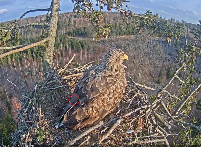 Pēdējā bildē var redzēt melnu kanti astes spalvām labajā pusē. Kad sēdēja zarā, to arī varēja redzēt -kam tāda ir?