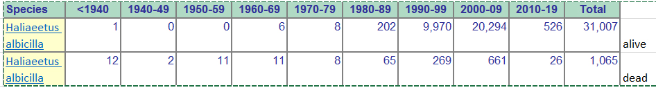 ES centrālā datubāze Euring uzrāda tikai jūras ērgļu populācijas uzskaitījumu pa desmitgadēm. Pēdējā pieejamā informācija par Latviju saka, ka no 1925-1999 gredzenoti 216 jūras ērgļi, atrasti 22. http://www.lubi.edu.lv/files/File/LATVI ... 9_latv.pdf Nesapratu, vai dzīvi vai miruši, jo Latvijas Gredzenošanas Centrs, LU Bioloģijas institūta struktūrvienība, kura ir atbildīga par putnu gredzenošanas darbu Latvijā, sniedz info tikai par gredzenoto jūras ērgļu skaitu, citas info nav.