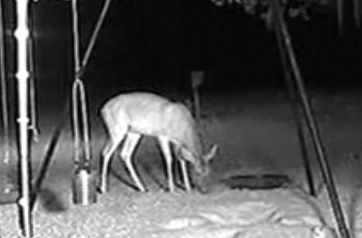 Ap 6.20 (Fl laiks), kad jau sāka aust gaisma, kamerā parādījās baltastes briežu bariņš, viens no bara ar nelieliem ragiem. Divi pienāca pie barības trauka un ēda kopā ar jenotiem.