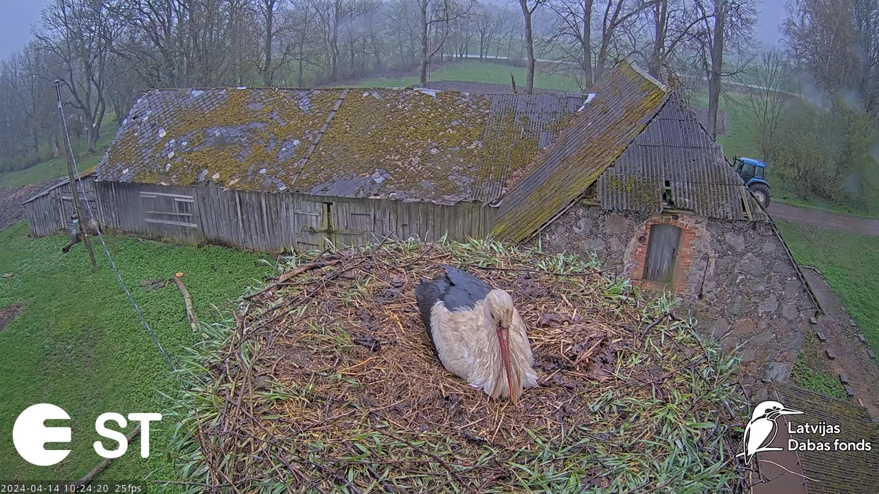 Pāris čubinās pa ligzdu. Ik pa brīdim saklabinās kaimiņi, mūsu pāris atsaucas. 16:38 redzams stārķis metam lokus fonā un aizlido uz tīrumu labajā pusē.