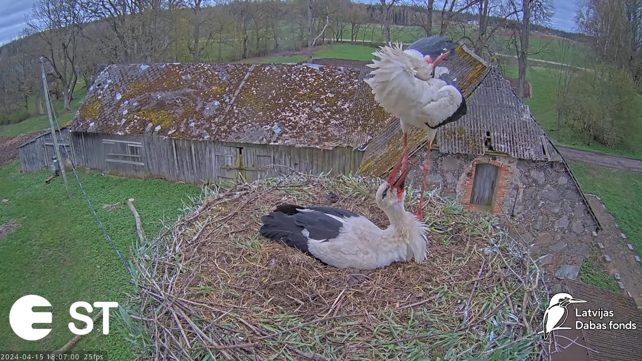 20:23 Zelta stundas apspīdēts, Tuks silda oliņas un vēro apkārt notiekošo. Šajā kadrā uz šķūņa mūra var labi redzēt mūsu (pa kreisi) un kaimiņu ligzdu (pa labi). Otrā ligzda ir būvēta uz staba ar divām kājām.